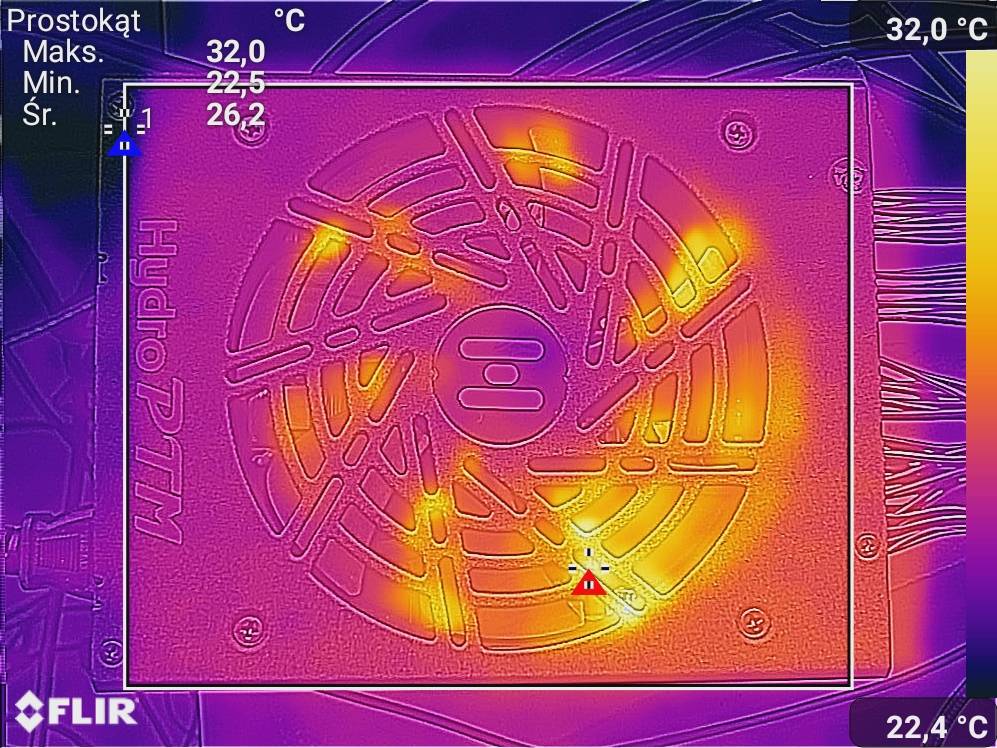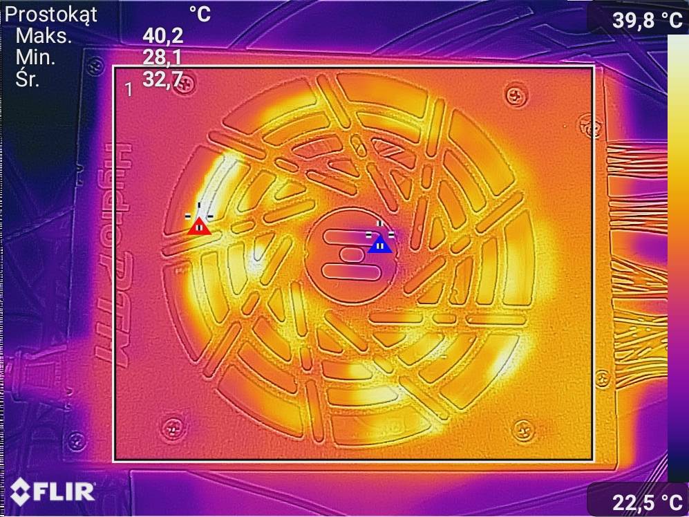 Spoczynek to wyświetlanie tylko pulpitu. Obciążeniem był FurMark oraz Cinebench R23, a zasilacz pracował w trybie ECO. Zdjęcia termowizyjne wykonałem dzięki smartfonowi CAT S61.
