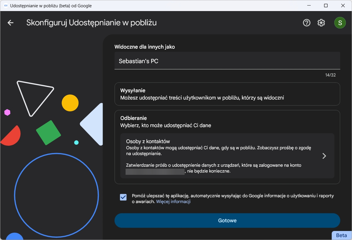Udostępnianie w pobliżu trzeba również włączyć z poziomu samego telefonu z Androidem. W tym celu przechodzimy do ustawień i klikamy na sekcję Google, następnie Urządzenia i udostępnianie, a na końcu Udostępnianie w pobliżu. W samej aplikacji dla systemu Windows warto zwrócić uwagę na ustawienia widoczności. Pierwsza z opcji oznacza widoczność dla wszystkich, ale można w niej ustawić widoczność tymczasową (na kilka minut).