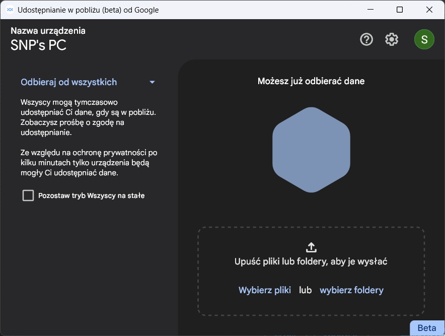 Co ciekawe, w głównym oknie programu mamy dostęp do wszystkich trybów widoczności podczas odbierania plików. Z kolei samo wysyłanie ogranicza się do przeciągnięcia pliku lub folderu na okno aplikacji. Udostępnianie w pobliżu działa też z poziomu menu kontekstowego, więc będąc w dowolnym katalogu można wskazać plik do przesłania na telefon. Wszystko działa i to całkiem sprawnie (przetestowałem transfer z telefonu z Androidem do peceta z Windows 11 i w drugą stronę). Są jakieś ograniczenia? Na razie z tego rozwiązania wyłączeni są posiadacze komputerów z procesorami ARM (a zatem tylko Intel lub AMD).