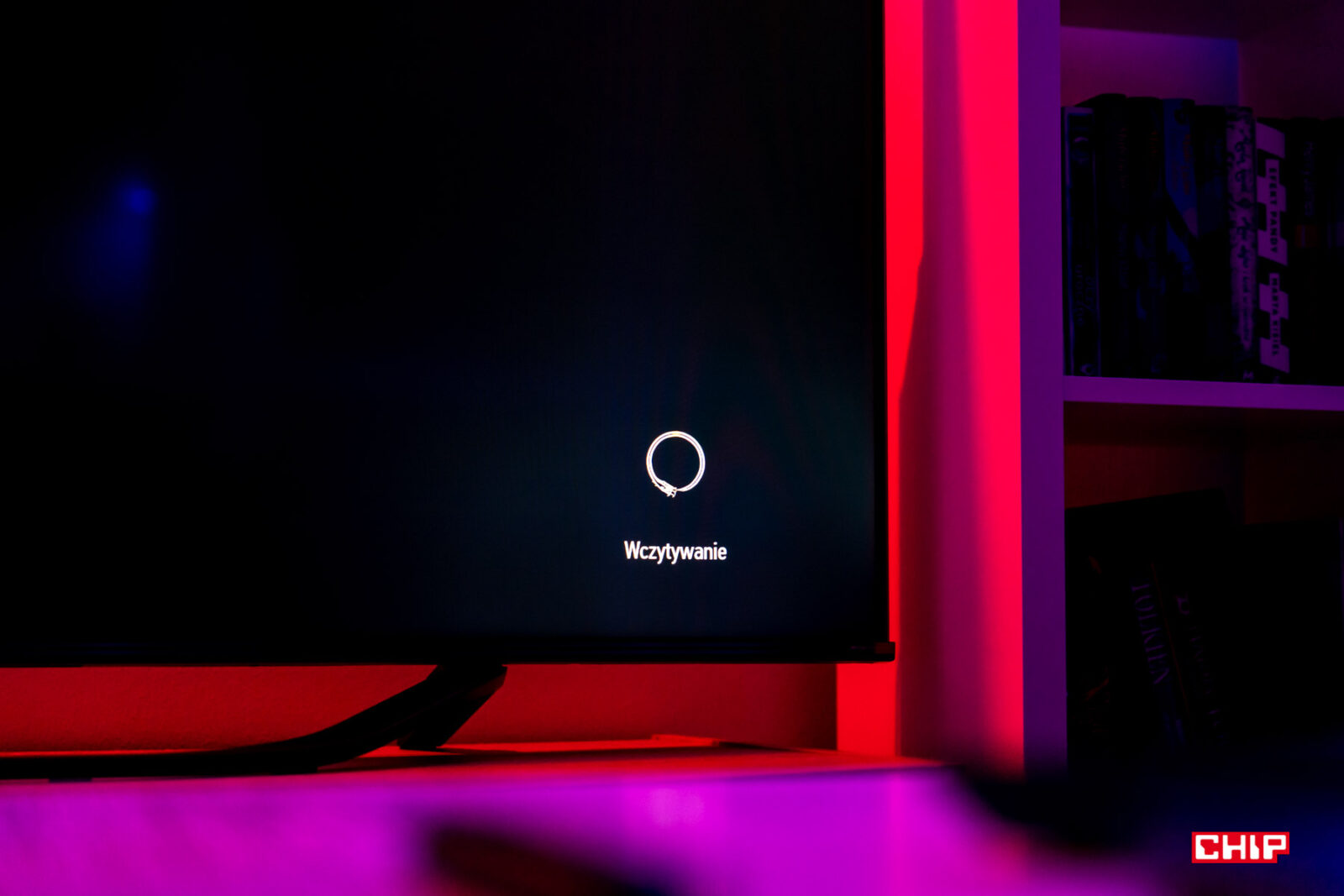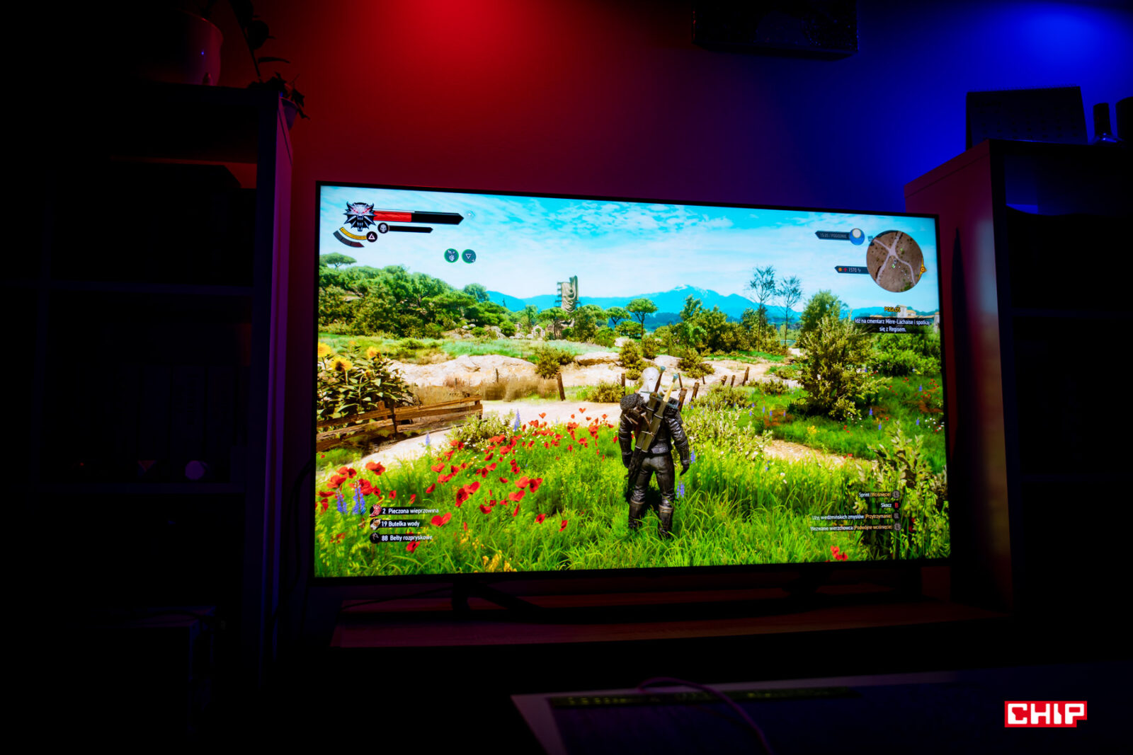 Strefy podświetlenia znacznie poprawiają jakość czerń, szczególnie w ciemniejszych materiałach, ale jest tu widoczny efekt halo. To poświata, która dokładnie pokazuje nam, w którym miejscu znajduje się strefa. Widać to bardzo dobrze na poniższym zdjęciu ekranu ładowania Wiedźmina 3, gdzie strefy są wygaszone, a podświetlona jest tylko ta wokół animacji w rogu panelu. Ale podczas codziennego użytkowania zauważycie to wyłącznie w takich momentach. W trakcie oglądania treści ciężko jest to dostrzec.
