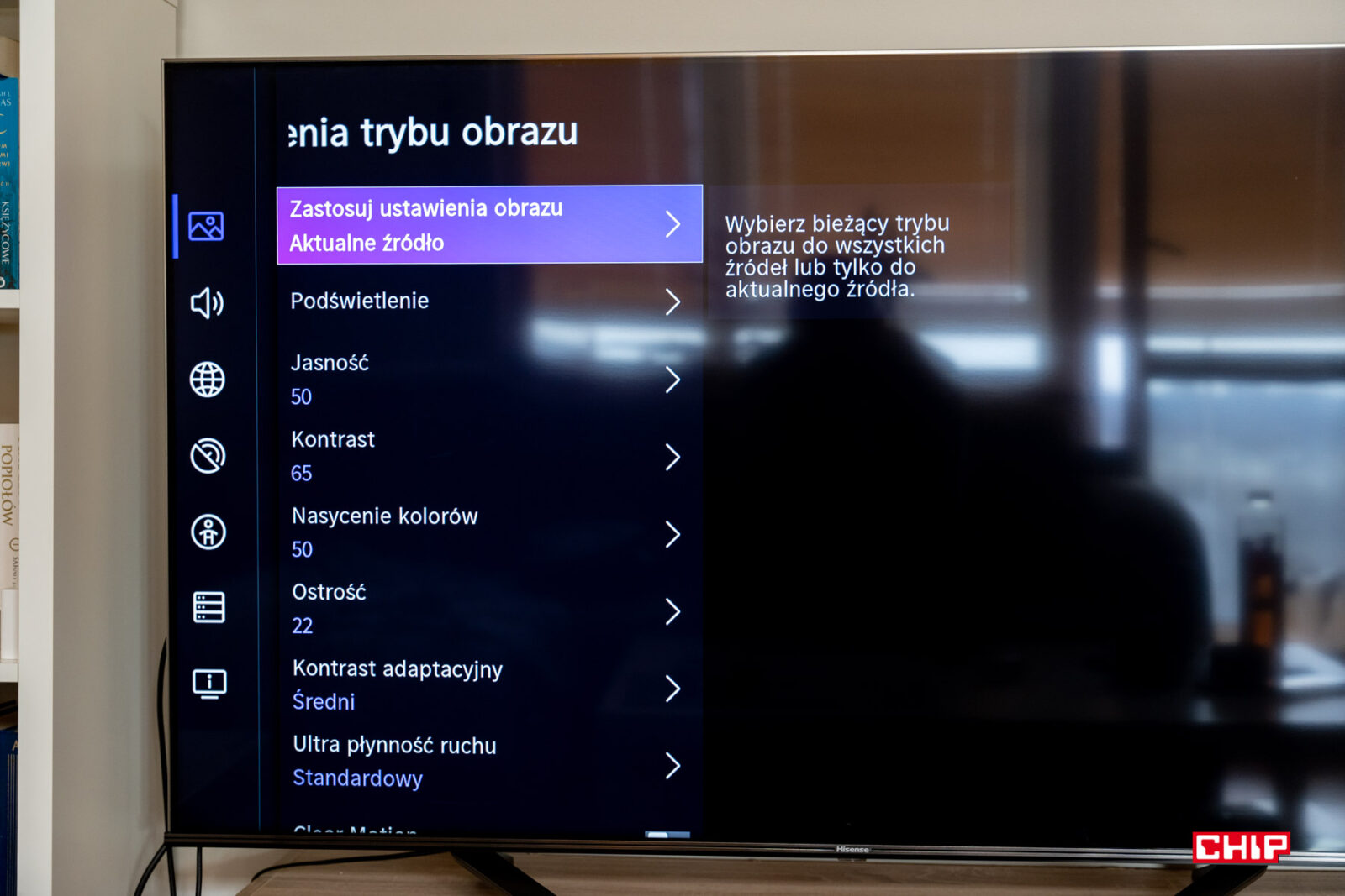 Poza tym jednym mankamentem, na dynamiczny obraz podczas grania w gry i oglądania sportu nie można narzekać. W celu poprawy płynności warto włączyć dodatkowe funkcje upiększające, co w niemal całkowicie niweluje efekt smużenia. Nie musimy się obawiać tego, że piłka w trakcie oglądania meczu zamieni się w kometę z jasnym ogonem. Warto jednak odpowiednio dopasować ustawienia obrazu i zdecydowanie rekomendowałbym przystosowanie osobnych profili dla gier i sportu. Domyślny tryb sportowy zdecydowanie za mocno bije po oczach jasnością i nasyceniem kolorów.