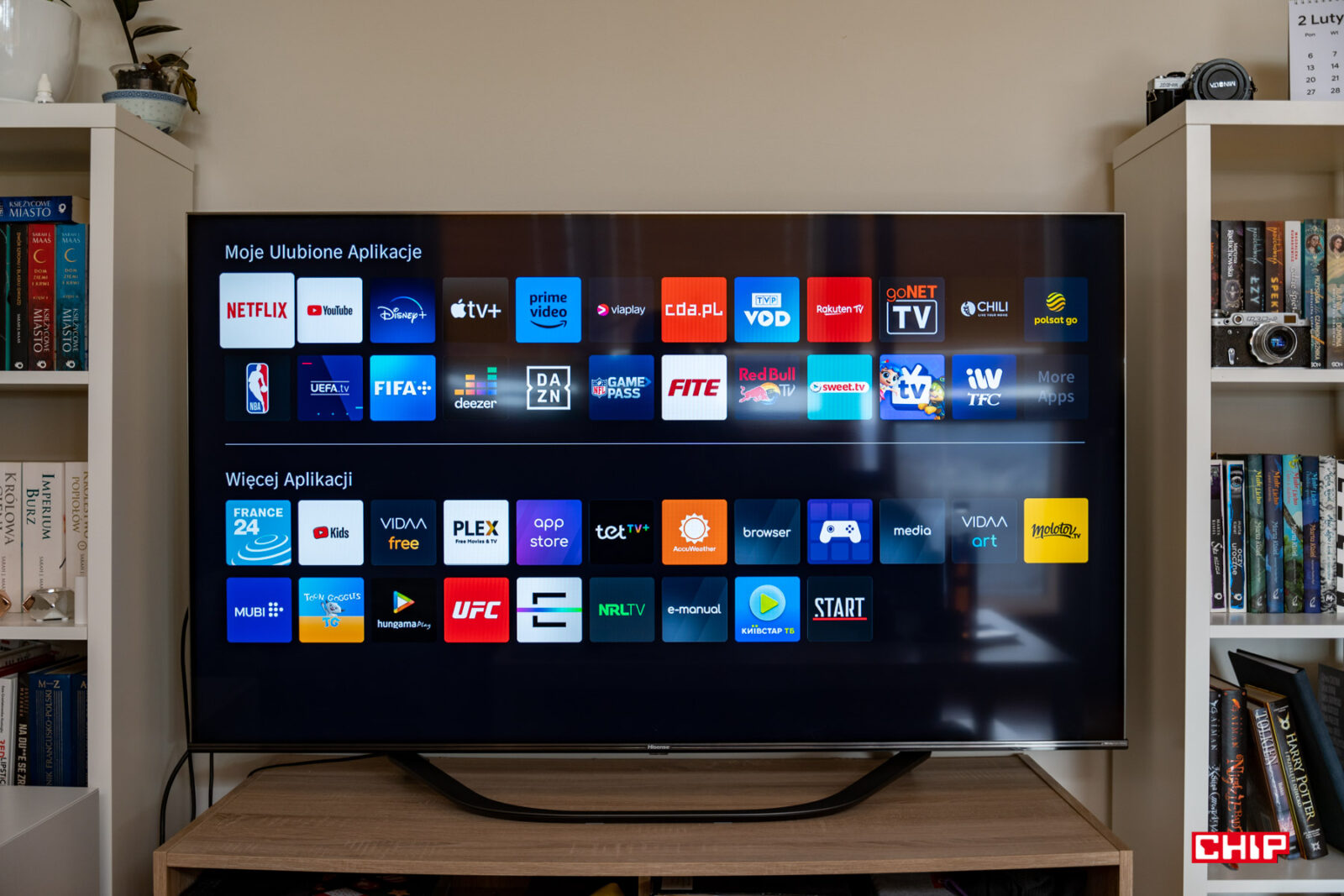 Obsługa systemu w zasadzie nie różni się mocno od innych wariantów smart TV. Jeśli mieliście z nimi wcześniej styczność, poradzicie sobie z obsługą VIDAA. Ustawienia telewizora są odpowiednio pogrupowane, mam wrażenie, że najbliżej im do Web OS LG. Z kolei ekran główny daje nam łatwy dostęp do podłączonych urządzeń oraz aplikacji. No i tutaj mamy dosyć sporą wadę systemu VIDAA, choć mocno zależną od preferencji użytkownika.