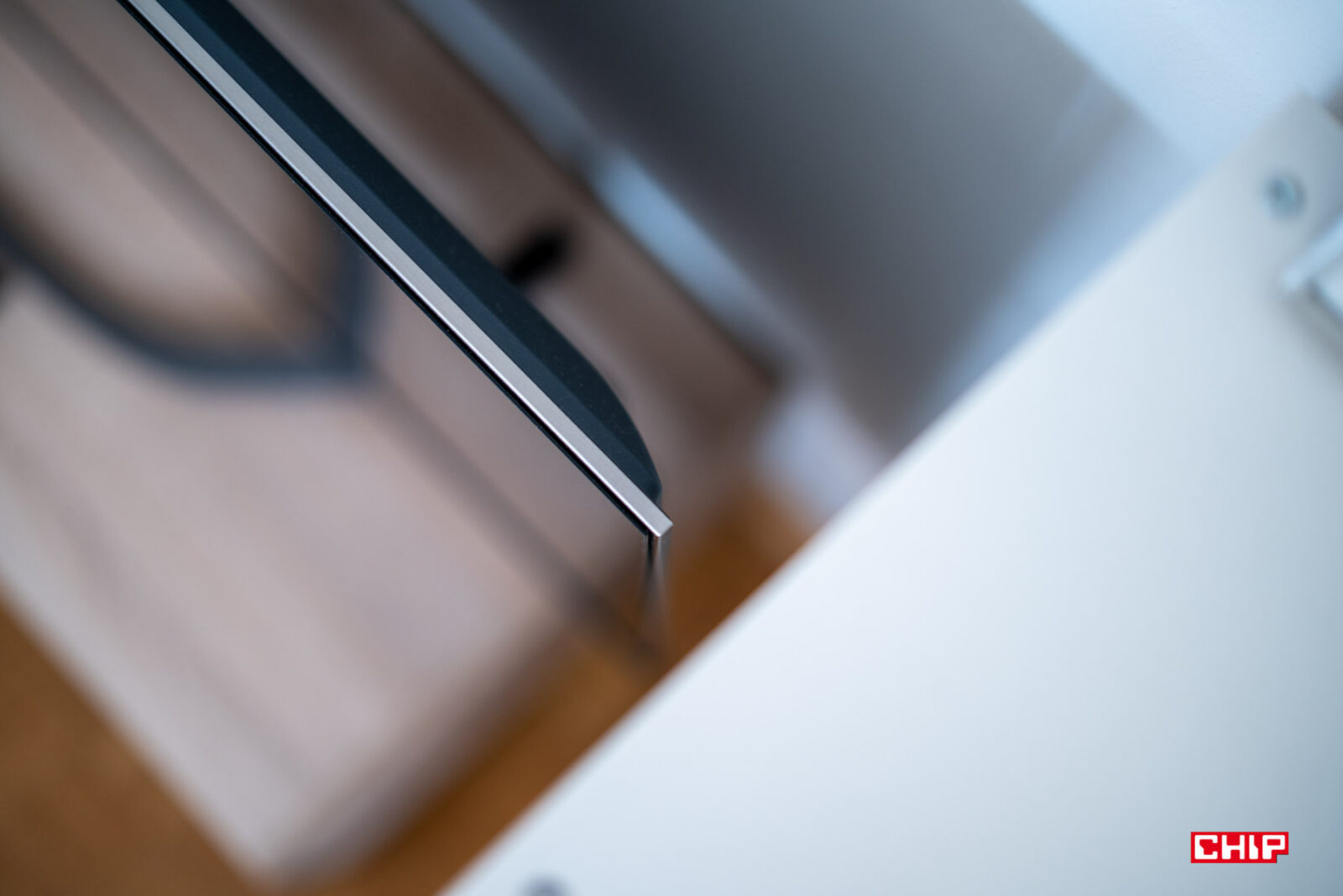 Telewizor z podstawą waży 15,3 kg (bez 14,4 kg) i bardzo łatwo można go przestawić w pojedynkę. To zasługa plastikowej obudowa, która w dotyku nie sprawia zbyt dobrego wrażenia, ale czy na co dzień macacie swój telewizor i faktycznie będzie to jakiś problem? Wątpię. Za to od strony wizualnej Hisense U7HQ wypada bardzo pozytywnie. Ma cienkie ramki, stopkę o ciekawym kształcie i prezentuje się to bardzo efektownie.