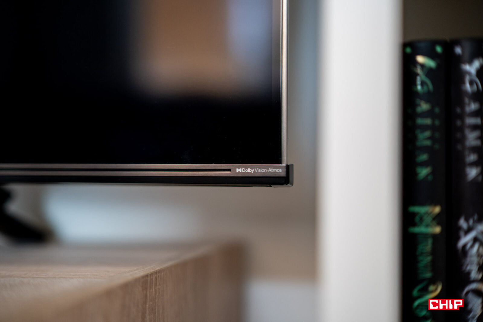 Z tyłu obudowy niewiele się dzieje, więc najważniejszym elementem są porty. Prostopadle na tylnej ściance mamy pory USB, LAN oraz cyfrowej wyjście audio. Na prawym boku drugi port USB, gniazdo serwisowe, cztery porty HDMI (2x 4K@60 Hz i 2x 4K@120 Hz), gniazda antenowe (DVB-T2), wejście AV oraz Jack 3,5mm.