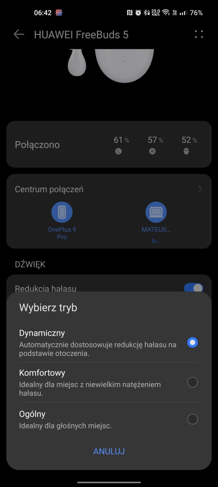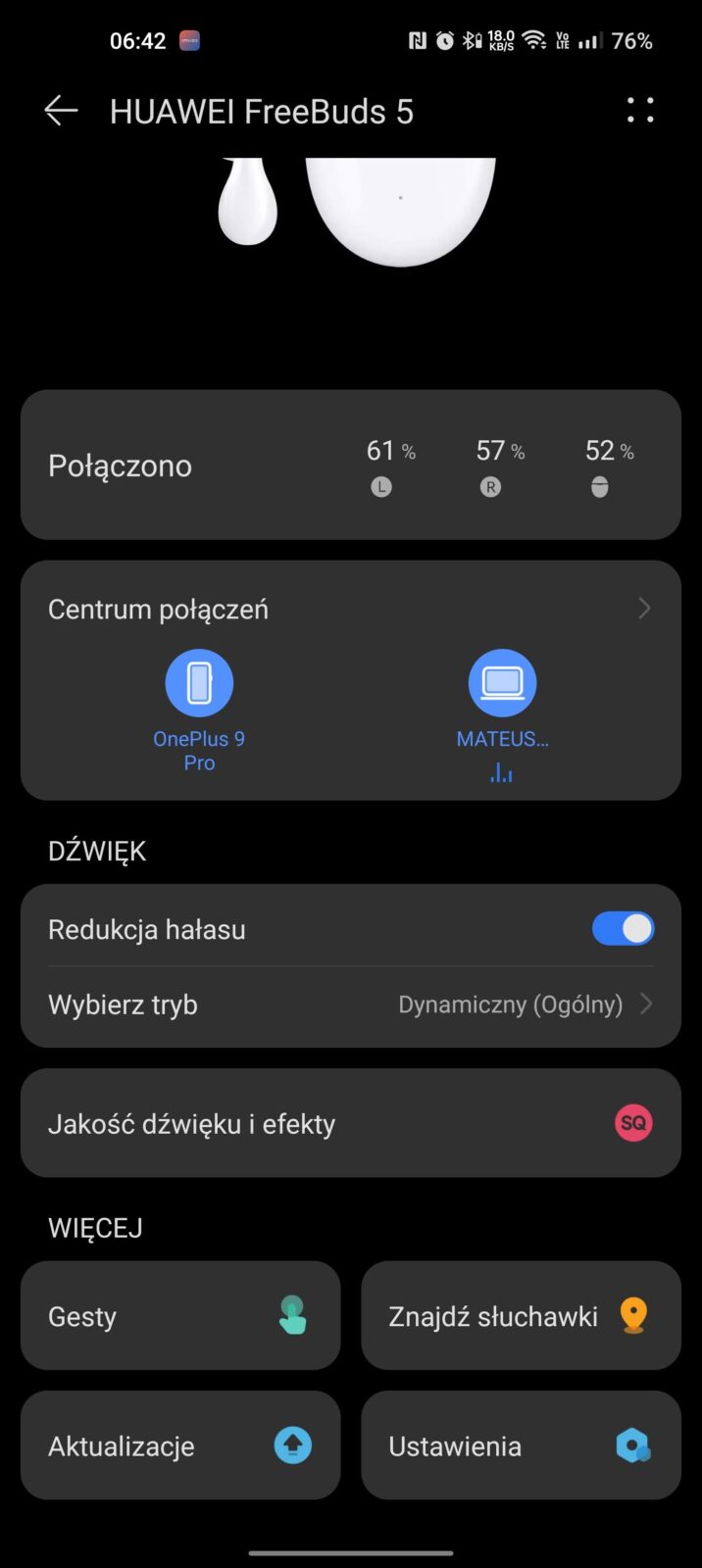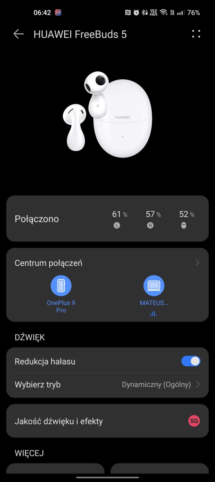Zacznę jednak od tego, co w FreeBuds 5 należy docenić, a jest tego sporo. Producent chwali się, że 11-mm przetwornik tych słuchawek odtwarza dźwięki w zakresie od 16 do 40000 Hz, że ich waga wynosi niewiele, bo 5,4 gramów, że wspierają łączność Bluetooth 5.2, kodek L2HC, LDAC i technologię AudioVivid, czy Spatial Audio, a tryb ANC radzi sobie śpiewająco z hałasem w otoczeniu. Poza tym ostatnim nie mogę się z tymi cechami FreeBuds 5 nie zgodzić, jak zresztą z tym, że 42-mAh akumulatory w słuchawkach zapewniają solidne 5 godzin pracy (według moich pomiarów około 3-3,5 godziny z włączonym ANC, dwoma podłączonymi urządzeniami i zaawansowanym kodekiem).