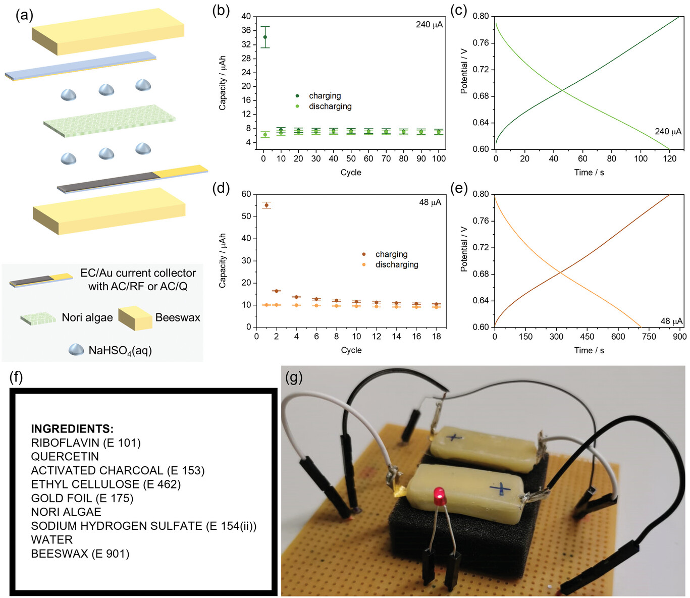 Naukowcy z Istituto Italiano di Tecnologia opracowali pierwszy w historii jadalny akumulator, którego można ładować. Co najciekawsze, ten jest wykonany nie z formy jadalnych chemikaliów, a z witamin i wodorostów nori, a ma w sobie wystarczająco duży potencjał energetyczny, aby zasilać małe urządzenia, takie jak diody LED i czujniki. Do działania wykorzystuje witaminę B2 jako anodę, suplement diety kwercetynę jako katodę, węgiel aktywny jako fundament dla nich oraz elektrolit na bazie wody. Obie elektrody są zamknięte w wosku pszczelim i łączą się ze sobą za pośrednictwem styków ze złota spożywczego, a wspomniane wodorosty norii służą jako separator.
