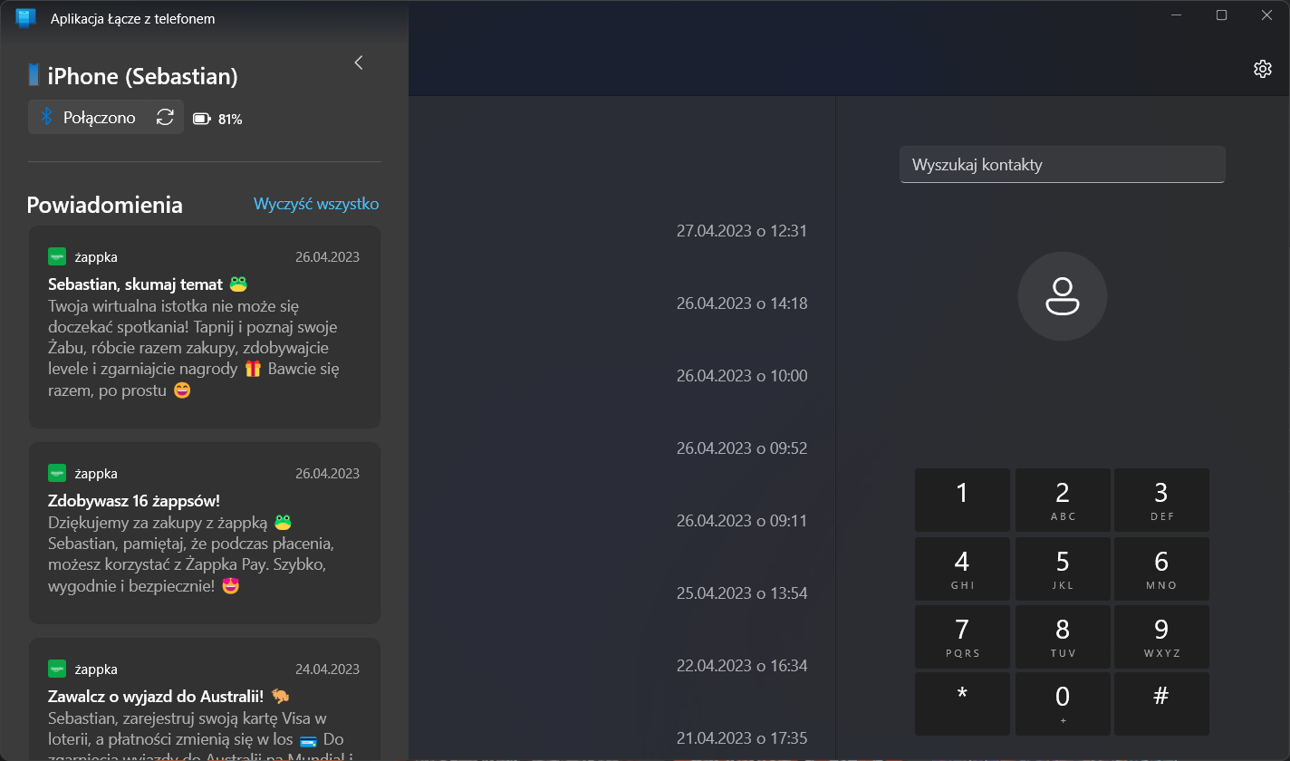 Co my tu zatem mamy? Z poziomu peceta z Windows 11 uzyskujemy dostęp do listy ostatnich wiadomości oraz połączeń telefonicznych. Oczywiście dostajemy powiadomienia o nadejściu nowych na pulpicie komputera, podobnie jak alerty o połączeniu przychodzącym. Z poziomu peceta można wysyłać wiadomości SMS (przetestowane i działa). Na tym w zasadzie kończy się współpraca. Możemy też podejrzeć ostatnie powiadomienia push, które przyszły na telefon.