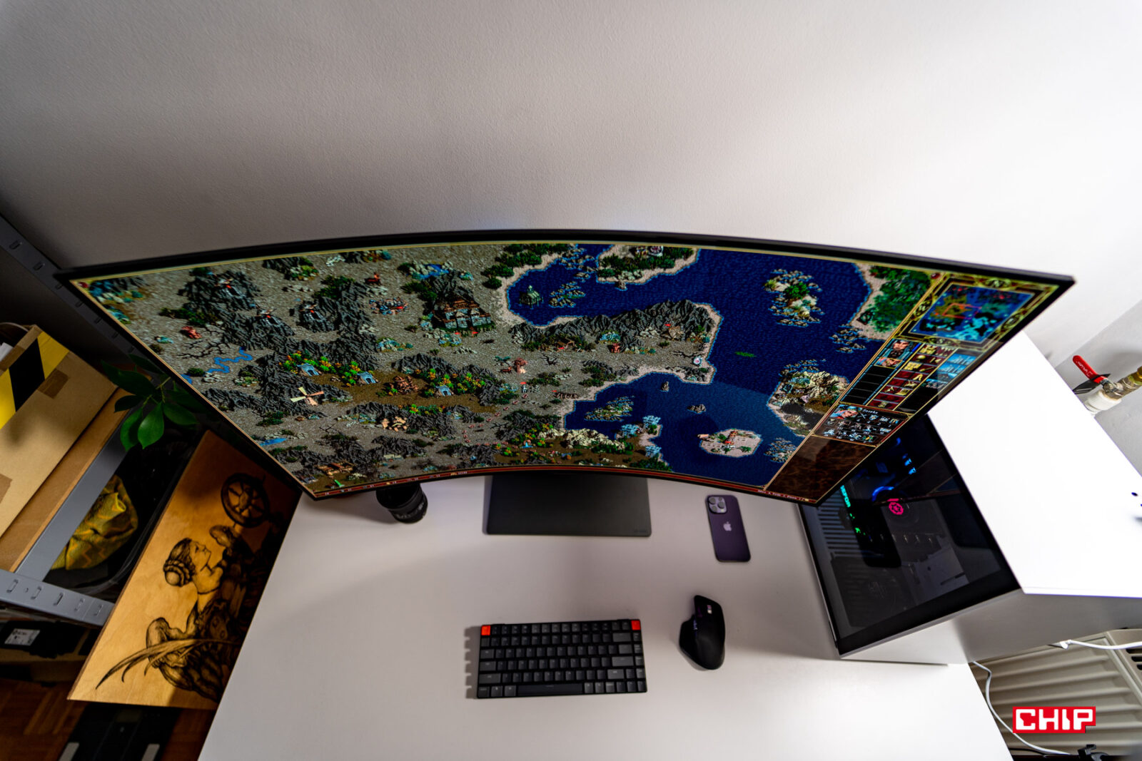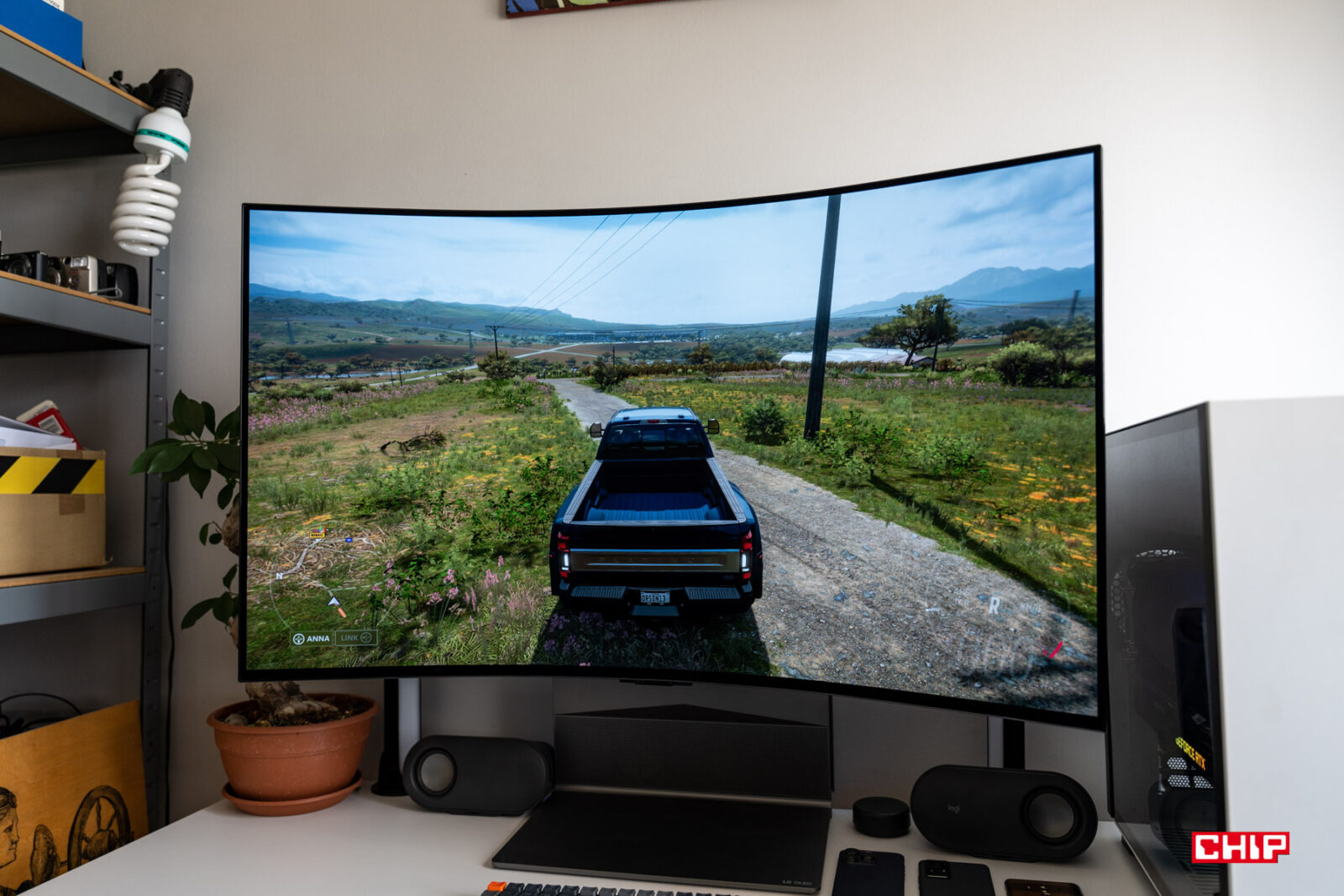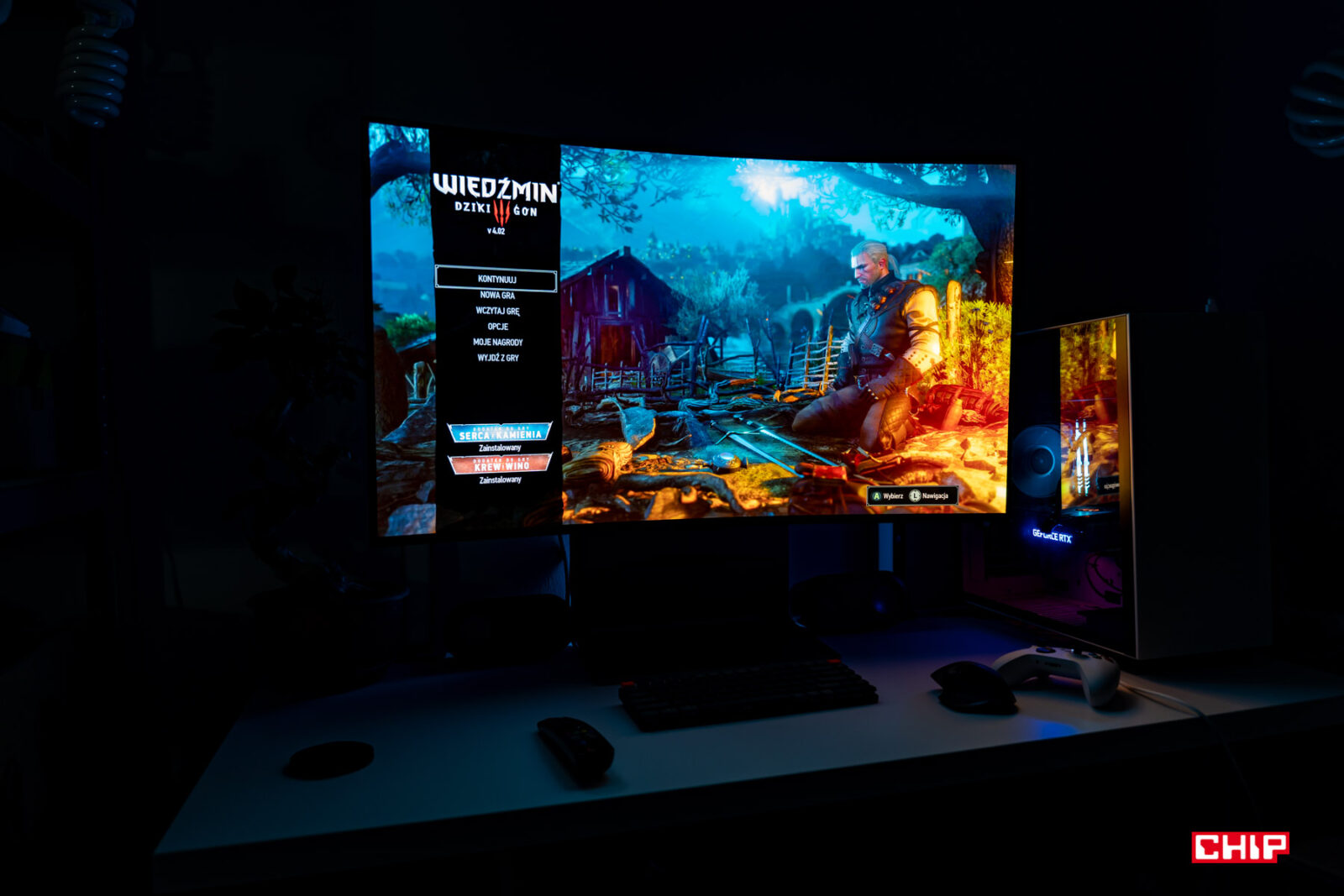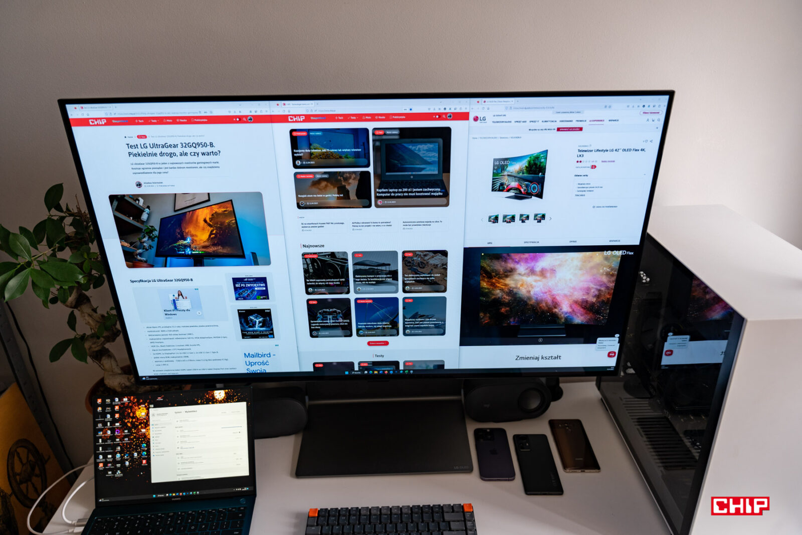 Korzystanie z płaskiego ekranu o takiej przekątnej i takich proporcjach (16:9) jest wybitnie niewygodne. Przerabiałem to niedawno z 42-calowym Asusem ROG Swift OLED. Taka przekątna jest zdecydowanie zbyt duża, trudna do ogarnięcia wzrokiem i w codziennej pracy to naprawdę katorga.