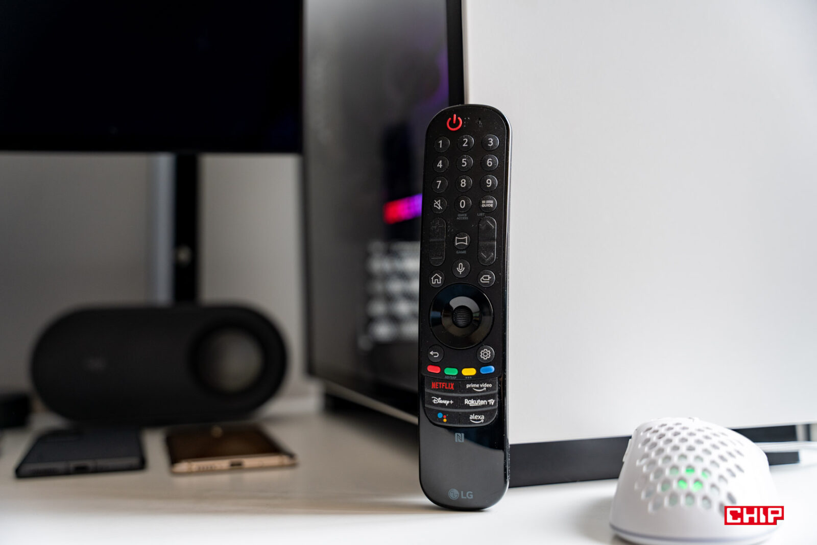Jeśli mamy doświadczenie z telewizorami LG, w LG Flex TV poczujemy się jak w domu. Urządzenie działa pod kontrolą systemu Web OS, znanego właśnie z telewizorów marki. Mamy tu ten sam układ ustawień i dodatkowych opcji oraz pilot Magic Remote z pokrętłem w przycisku zatwierdzania oraz opcję sterowania kursorem za pomocą ruchu dłoni trzymającej pilot. Niestety podobnie jak telewizorowe piloty LG, mógłby wyglądać nieco nowocześniej. A przez to, że ma duże gumowe przyciski, strasznie szybko pokrywa się kurzem, który trudno z niego zetrzeć.