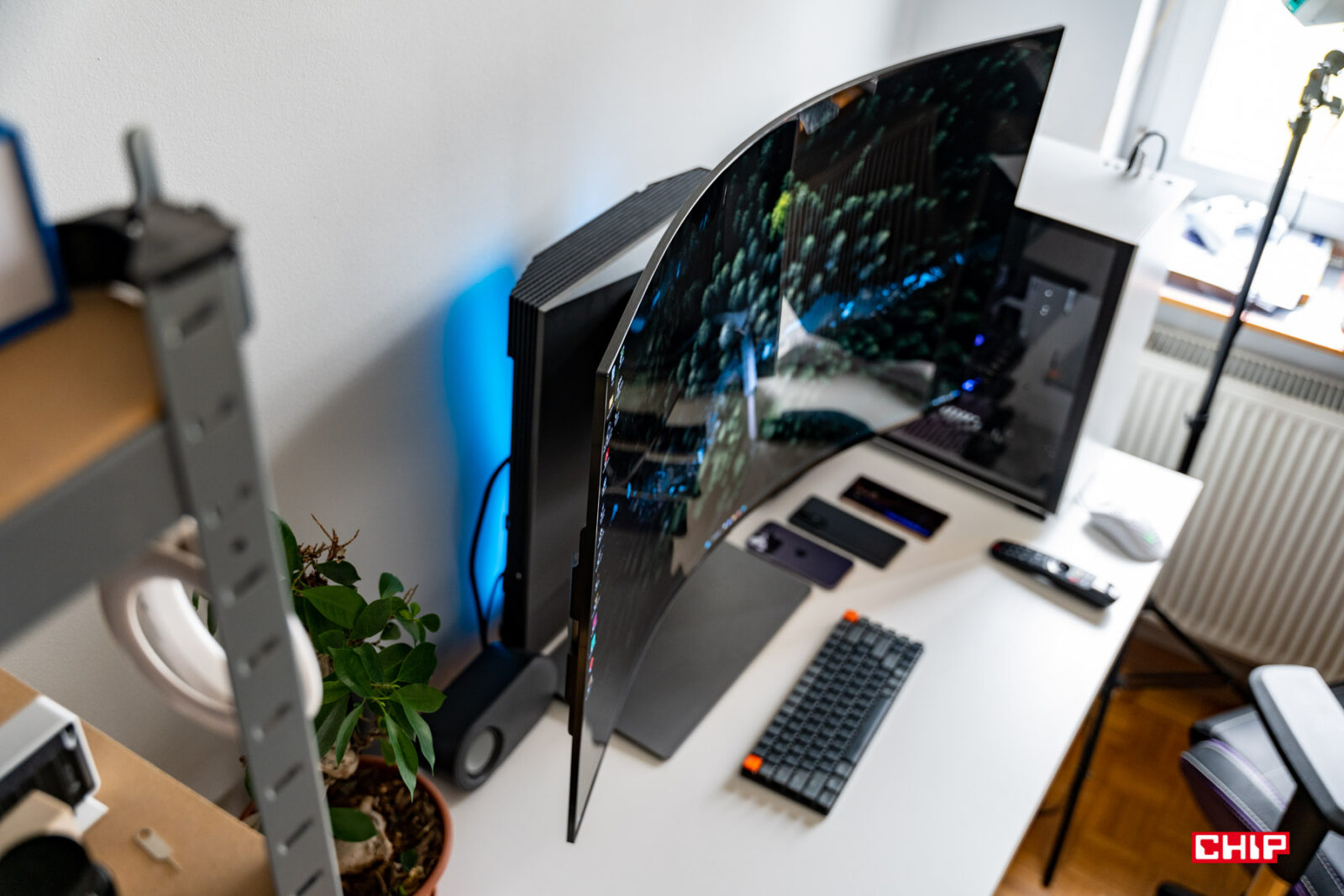 Praca czy granie na 42-calowym monitorze nie są wygodne, do czego za moment przejdziemy, ale na zagiętym to już inna bajka. Za to filmy zdecydowanie wygodniej ogląda się na płaskim ekranie. Skoro panele OLED są elastyczne i można je dowolnie zginać, to dlaczego tego nie zautomatyzować? Genialne po raz kolejny!