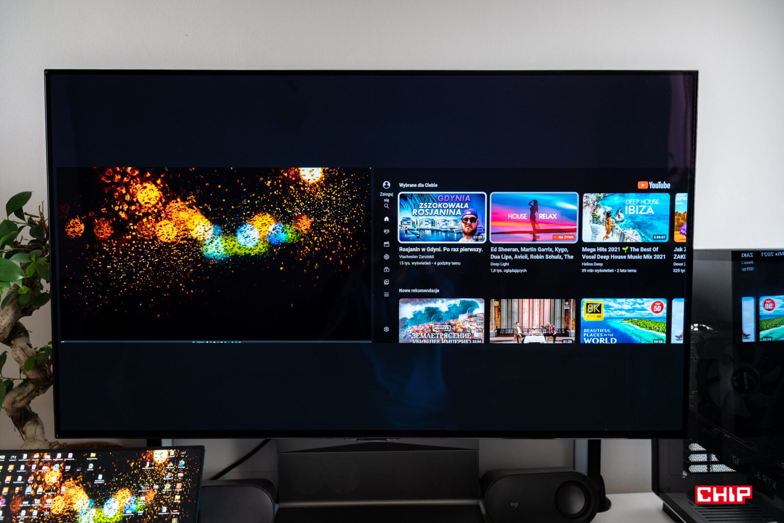 W tym wszystkim brakowało mi mocno jednej funkcji i jak się okazało, zwyczajnie nie umiałem jej znaleźć. Powierzchnię roboczą możemy zmieniać, zmniejszając ją do 27 lub 32 cali. Co może się przydać w przypadku niektórych gier. Mamy też funkcję Multi-View, która jest zamiennikiem Picture-In-Picture (którego tu nie ma) i pozwala ustawić obok siebie dwa symetryczne, wirtualne ekrany. Na jednym możemy mieć telewizor, na drugim YouTube, telewizję, czy obraz z urządzenia mobilnego. Nie mogłem jednak znaleźć funkcji zmiany proporcji ekranu na bardziej panoramiczne, z ucięciem obrazu w górnej i dolnej części. To znacznie ułatwiłoby pracę na kilku oknach i taka funkcja znajduje się głęboko w ustawieniach gamingowych. Można zmienić proporcje obrazu z 16:9 na 21:9 lub 32:9, ale zmiana wymaga też zmiany rozdzielczości obrazu na komputerze. Początkowo komputer uparcie mi tę opcję blokował, przez co byłem pewny, że jej tu nie ma. Jest, działa i jest bardzo przydatna.