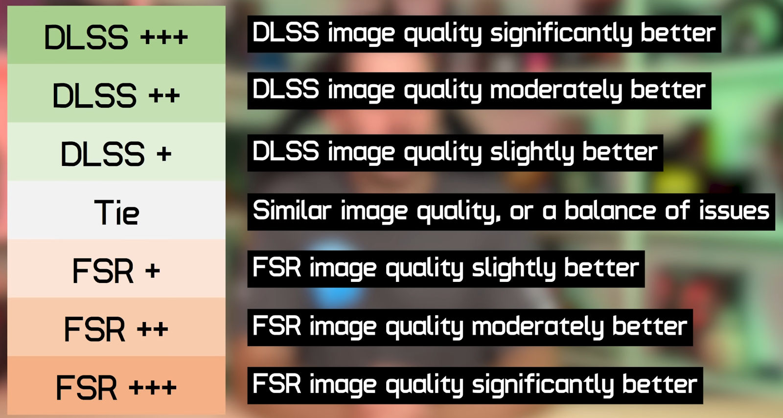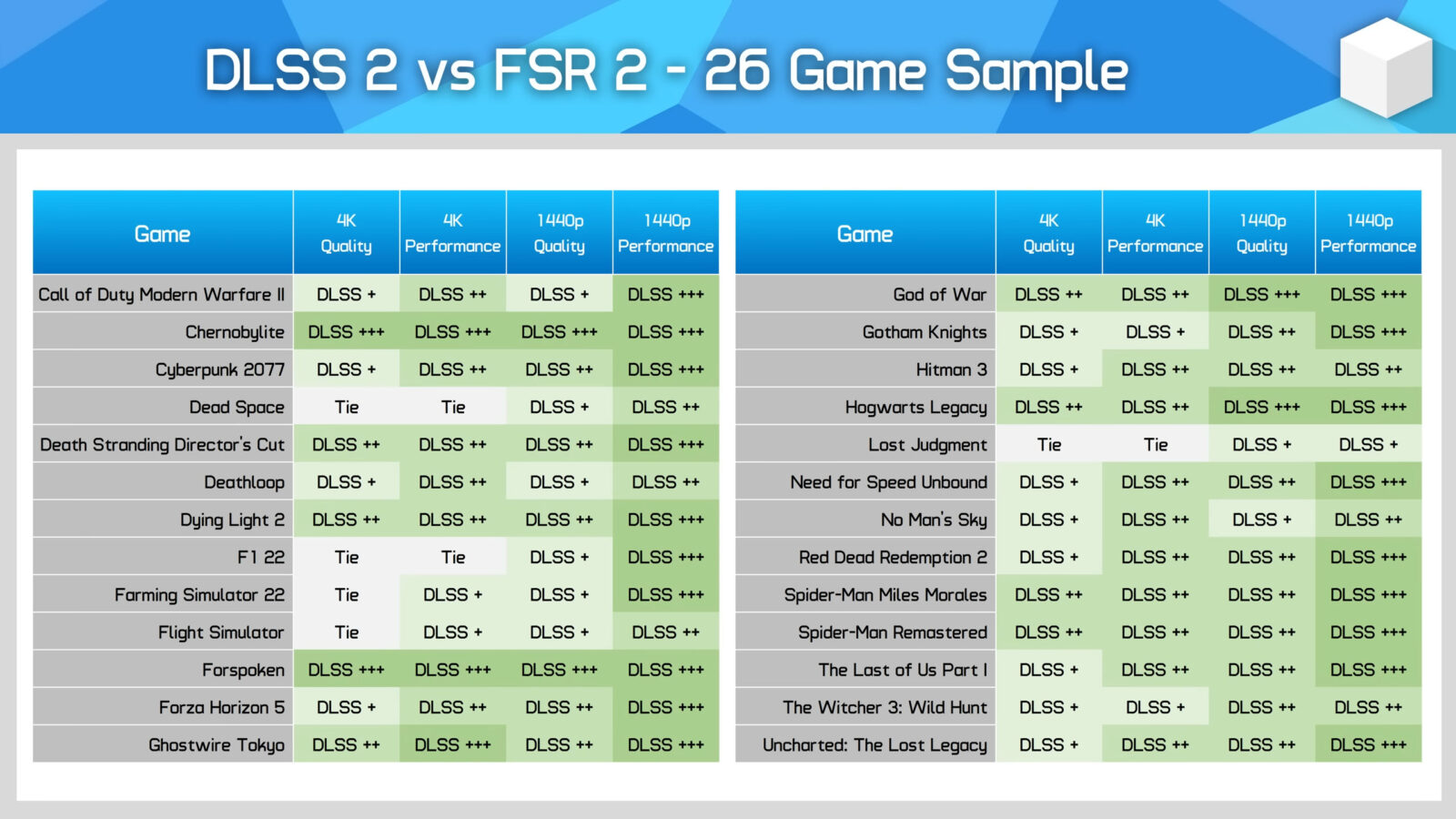 Powyższej możecie podejrzeć najważniejsze wnioski testu twórcy na kanale HardwareUnboxed, który porównał FSR i DLSS w ich drugiej generacji (i bez żadnych modyfikacji) w aż 26 grach. Zdecydował się na porównanie rozdzielczości 4K i 2K w trybie Jakości oraz wydajności, a wyniki mówią same za siebie. W kwestii finalnej jakości DLSS 2.0 jest lepszy. Tyczy się to zwłaszcza trybu wydajności, a więc skalowania z niższej rozdzielczości do wyższej, bo FSR oferował tę samą jakość tylko w czterech grach, kiedy w grę wchodziło renderowanie do 4K w trybie Quality. Różnice możecie podejrzeć na nagraniu, które porównuje jakość obu obrazów, ale musicie pamiętać, że kompresja wideo wprowadzana przez YouTube niweluje w dużej mierze tę różnice.