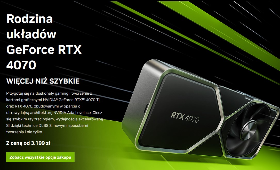 Najpierw firma chciała wmówić nam, że RTX 4070 Ti to tak naprawdę RTX 4080, a teraz zaczęła pompować marketingowo swoje karty GeForce RTX 4070. Oczywiście sprawdziliśmy je w testach i potwierdziliśmy, że międzygeneracyjny skok wydajności jest widoczny na pierwszy rzut oka…, ale RTX 4070 w ogólnym rozrachunku nie zachwyca aż tak bardzo. Jego wydajność odpowiada wprawdzie GeForce RTX 3080, a różnica względem RTX 3070 jest znacząca, bo sprowadza się do prawie 35-procentowego wzrostu wydajności w grach (w rozdzielczości Full HD), ale jeśli spojrzymy na cenę, to tak kolorowo już nie będzie. Za GeForce RTX 3070 w Polsce w dniu premiery płaciliśmy około 2400 zł, a za RTX 3080 już 3279 zł, czyli praktycznie tyle samo, ile aktualnie za RTX 4070.