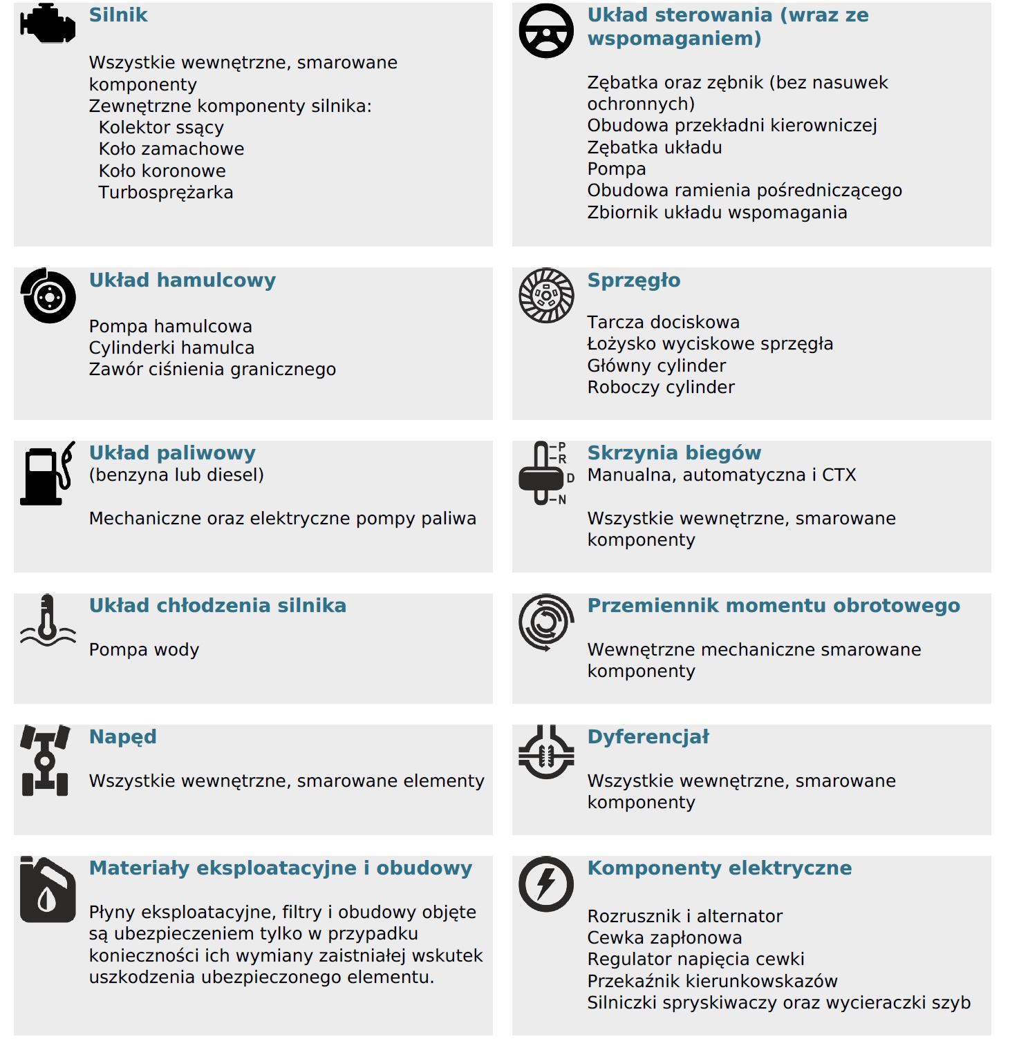 OTOMOTO Pay to również ubezpieczenie. Z jednej strony podstawowe, czyli OC i AC. W ramach usługi możemy skorzystać z oferty 15 towarzystw ubezpieczeniowych. Po wybraniu najkorzystniejszej opłata może być dołączona do comiesięcznych rat za samochód. Z drugiej strony do zakupionego pojazdu możemy dołożyć gwarancję roczną z limitem 20 tys. kilometrów. Zapewni nam ona zwrot kosztów nieprzewidzianych napraw, które mogą pojawić się po zakupie auta. Co jest objęte gwarancją? Chyba prościej będzie powiedzieć, co nie jest, bo ochrona obejmuje następujące komponenty: