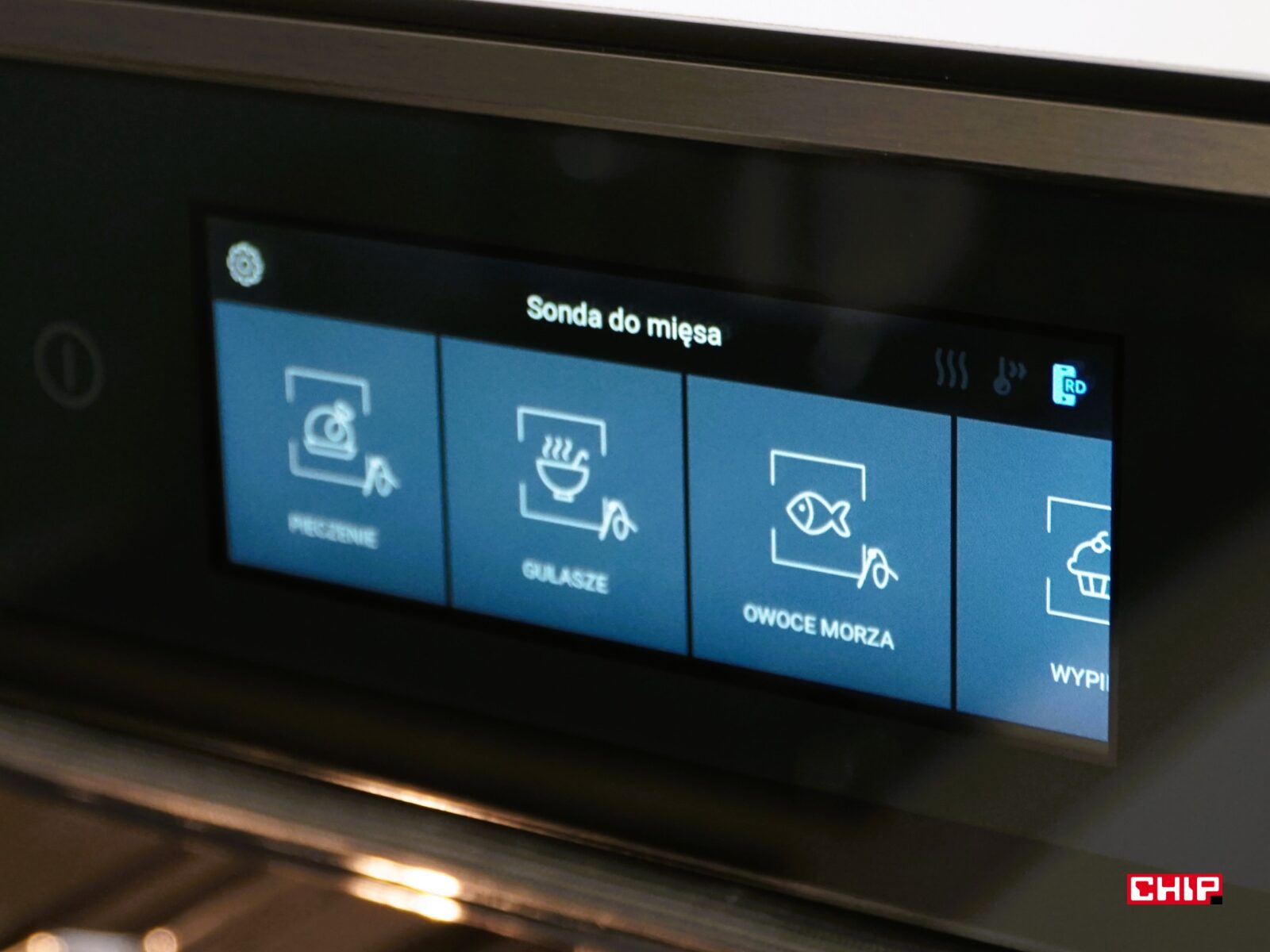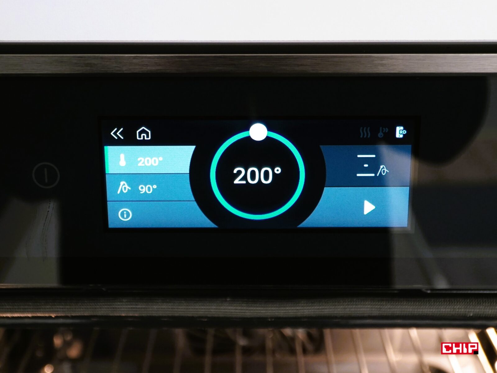 Wszelkie pokrętła na przednim panelu zastępuje wygodny ekran dotykowy umieszczony centralnie nad drzwiami. Przyjąłem, że do mnie należy tylko przygotowanie potrawy według przepisu i włożenie jej do piekarnika. Na początku bałem się jak panel sterowania zareaguje na ciepło sączące się spod spodu, ale specjalnie zaprojektowany system wentylacji dba o to, żeby rozpraszać strumień gorącego powietrza wydobywający się ze środka piekarnika. Panel wydaje się zatem bezpieczny.