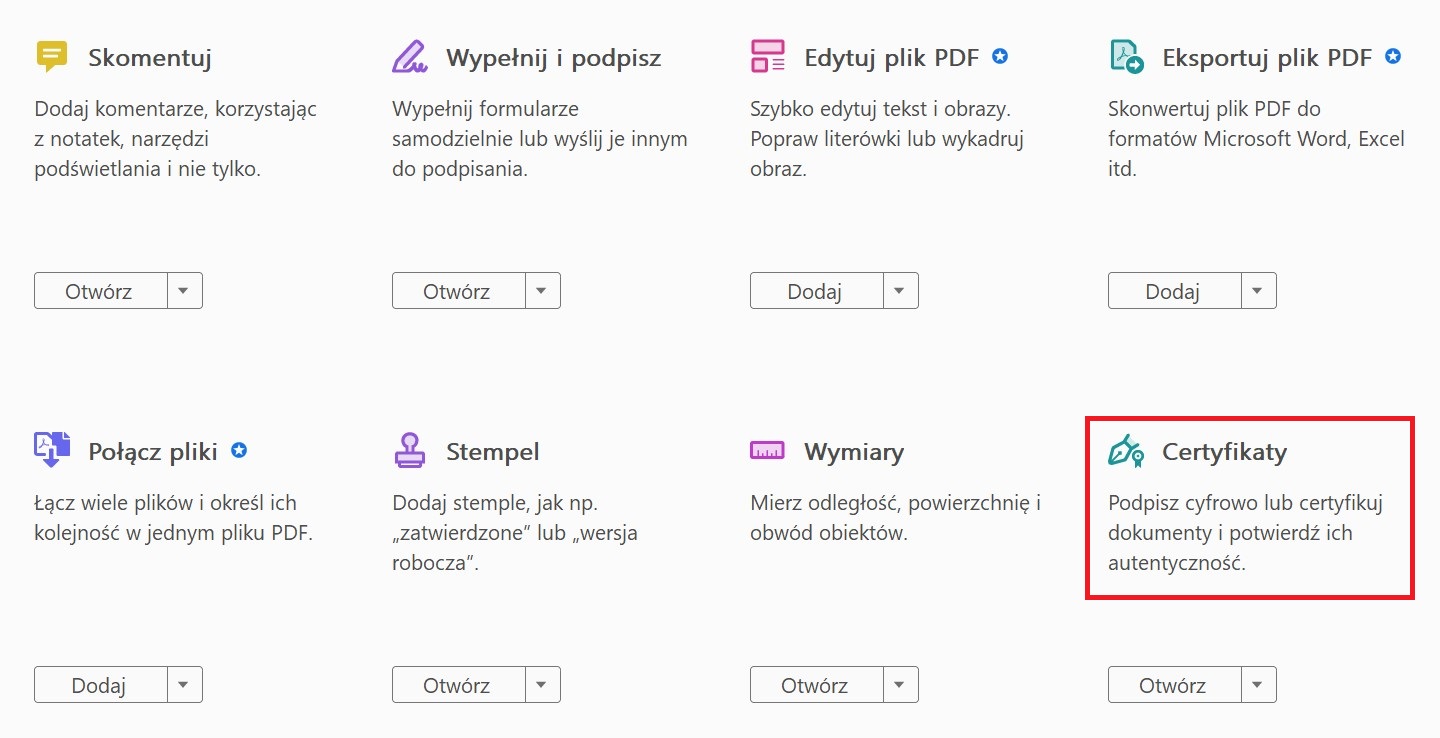 W przypadku podpisywania pliku PDF w programie Adobe, przejdź do zakładki „Narzędzia” i wybierz „Certyfikaty”. Analogicznie podczas procesu program poprosi Cię o wybór certyfikatu i autoryzację PIN-em.