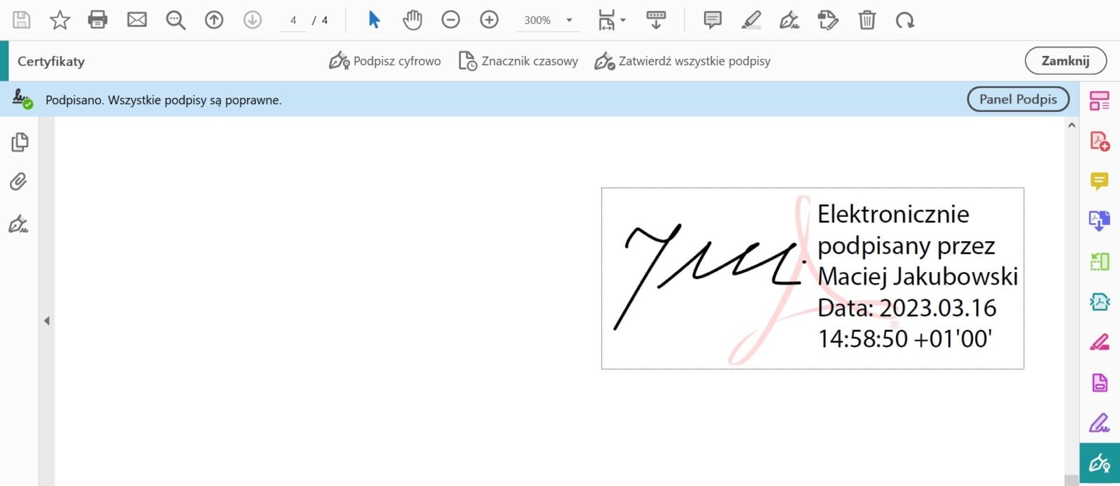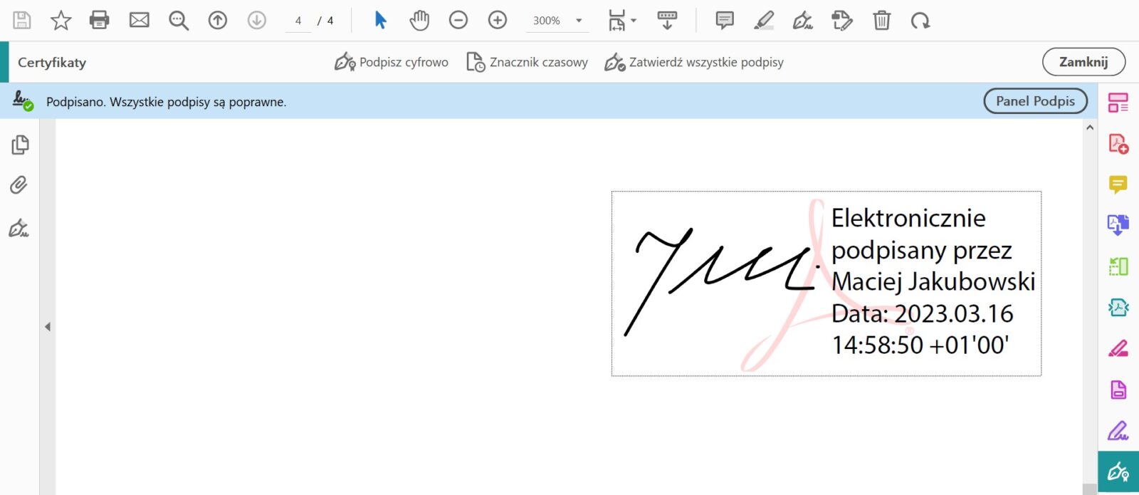 - Automatycznie weryfikuje się w czytnikach PDF, np. Adobe Reader.
