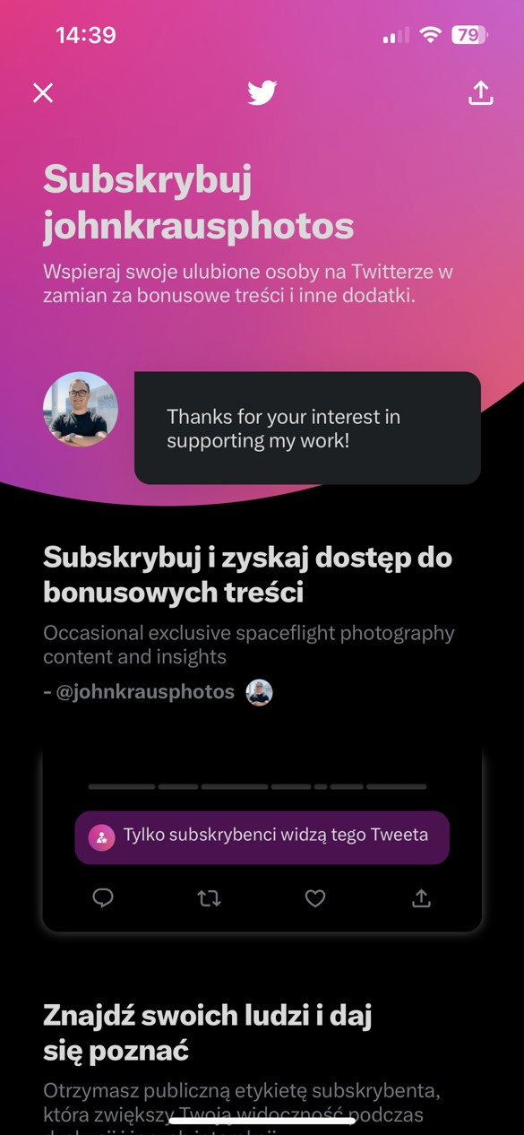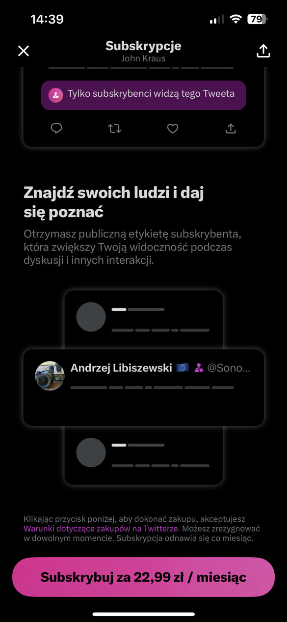 Takie posunięcie staje się bardziej zrozumiałe, jeśli się weźmie pod uwagę nowo wprowadzone subskrypcje. Decydując się na wsparcie twórcy na Twitterze uzyskujemy dostęp do osobnej zakładki z treściami dla subskrybentów, powiadomień o specjalnych publikacjach, konwersacji i rzecz jasna stosownego „odznaczenia”. Dostępne są trzy poziomy wsparcia, przy czym o jego wysokości decyduje wyłącznie twórca: 2,99 dol, 4,99 dol. oraz 9,99 dol., od których (po odliczeniu należności dla Apple lub Google) przez rok Twitter ma nie pobierać własnej prowizji. Docelowo do kieszeni twórcy ma trafiać 97% wpłat do wysokości 50 tys. dolarów łącznie oraz 80% po przekroczeniu tego progu.
