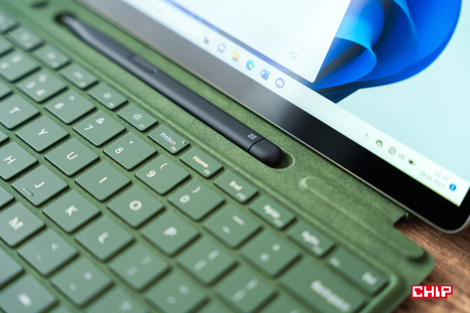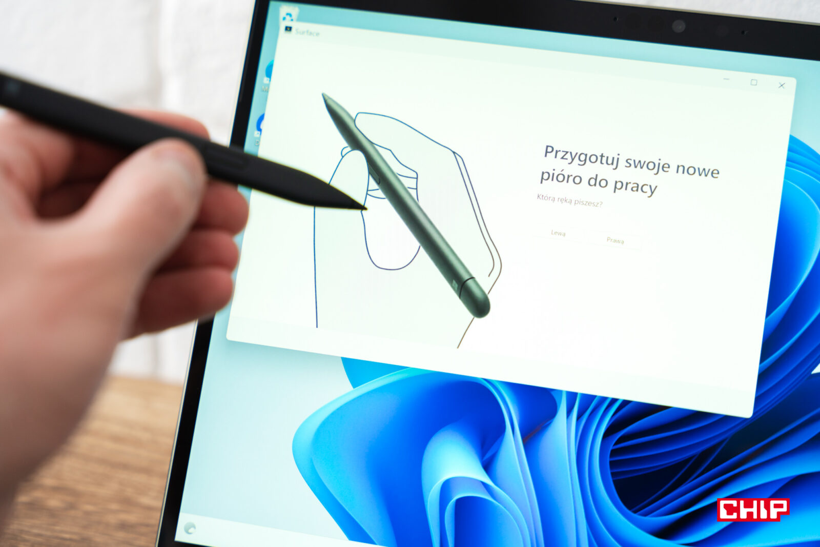 Osobiście bardzo lubię dołączaną klawiaturę Surface Pro, ale trzeba przyznać, że obiektywnie nie jest ona równie dobra, przede wszystkim przez brak sztywności. Cały pulpit roboczy wyraźnie się ugina, gdy podłączymy klawiaturę magnetycznym zaczepem pod kątem, a tylko tak da się z klawiatury korzystać trzymając urządzenie na kolanach czy na niewielkim stoliku. Na plus jednak trzeba zaliczyć jakość wykonania; dołączane klawiatury do Surface Pro 9 może kosztują krocie, ale za to wykonane są wzorowo i pokrywa jest przyjemna w dotyku alcantara. Dodatkowo możemy wybrać wersję klawiatury, która skrywa smukłą odmianę piórka Surface Pen tuż przy zaczepie, chowając piórko sprytnie, gdy nie jest nam potrzebne.