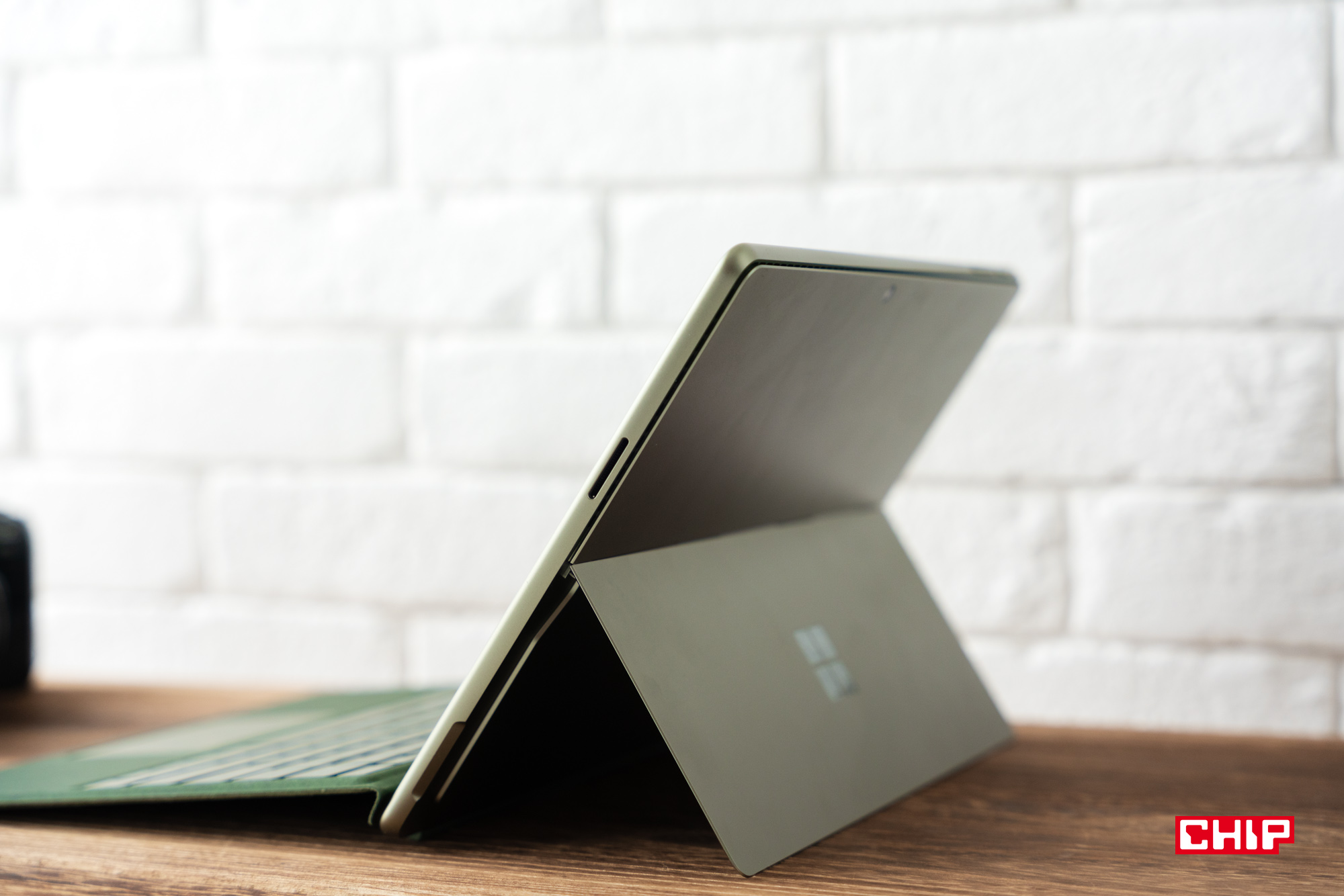 Tablet z kolei trafił do mnie w unikalnym, zielonym kolorze, który bardzo przypadł mi do gustu. Konstrukcja waży raptem 879 g (bez klawiatury), ale jest nadspodziewanie „gęsta” i wykonana z niebywałą precyzją. Ogromne wrażenie robi też sztywność podpórki, którą można ustawić pod dowolnym kątem.