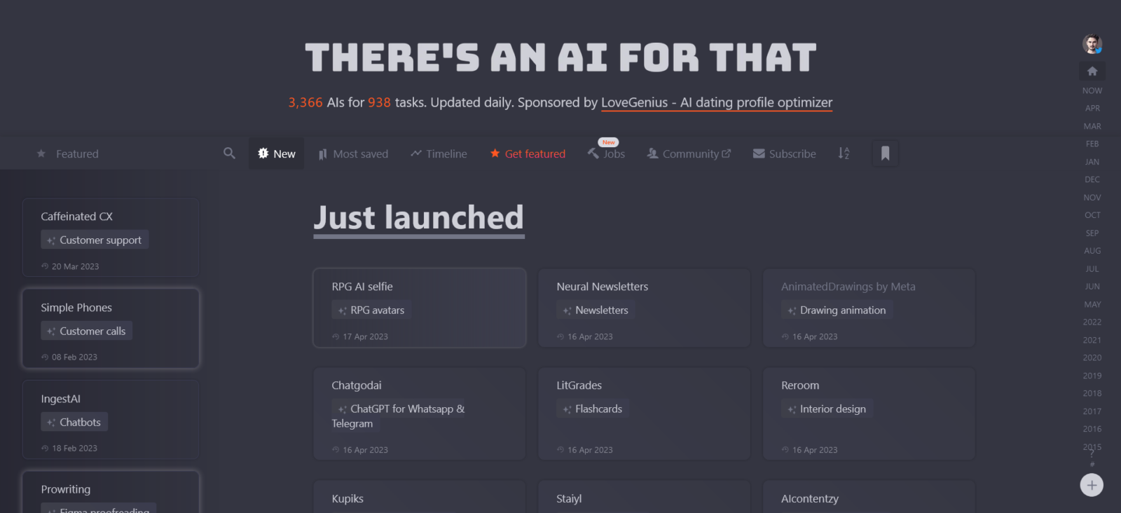 Jeden rzut oka na stronę There’s An AI For That dał mi do zrozumienia, że ta działka przeistoczyła się w jeden wielki rój. Dość wspomnieć, że w samym serwisie udało się do tej pory zebrać ponad 3300 projektów ułatwiających wykonywanie niemal 1000 różnych zadań. Najwcześniejsze z nich sięgają kilku lat wstecz (2015 roku).