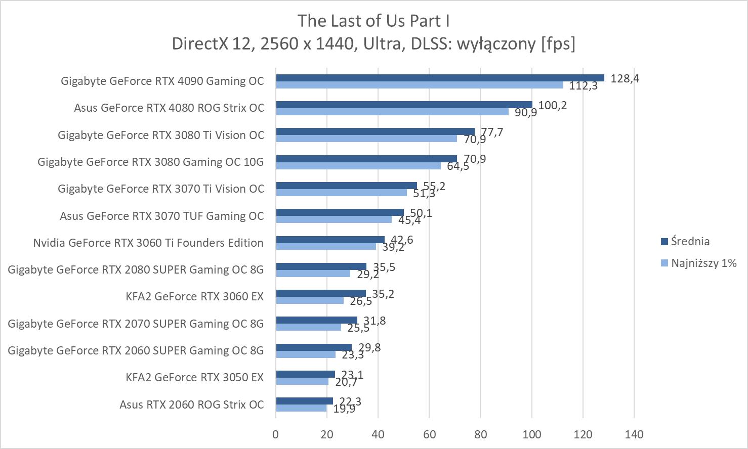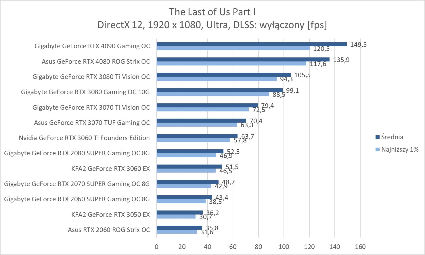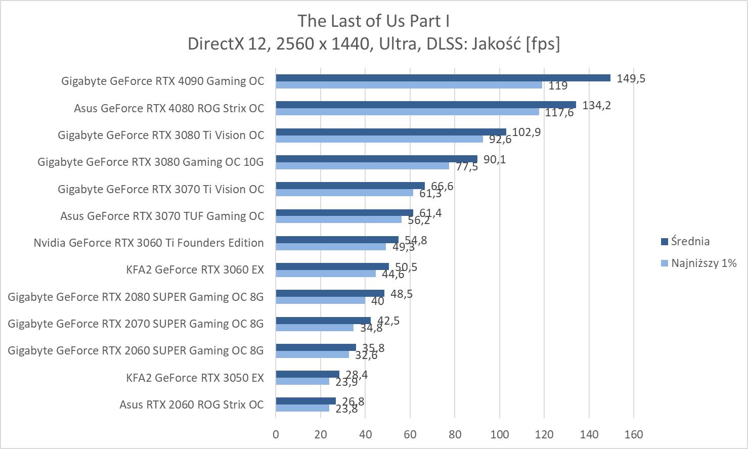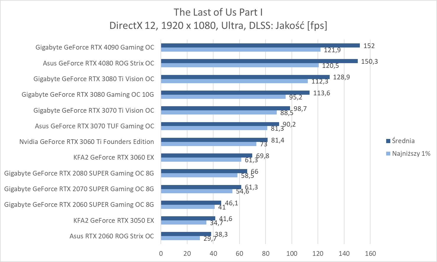 Na szczęście The Last of Us Part I ma DLSS. Po jego włączeniu w trybie Jakość średnio 60 fps zapewnia już RTX 2070 SUPER. Przy słabszych kartach warto rozważyć włączenie tej opcji w innym trybie, który zapewni lepsze wyniki.