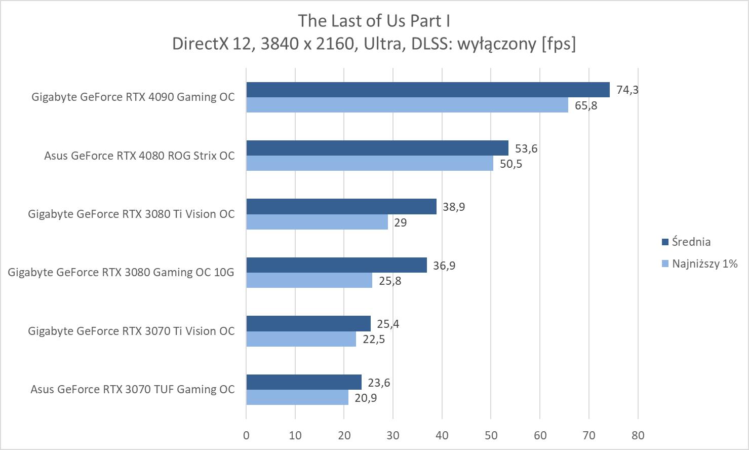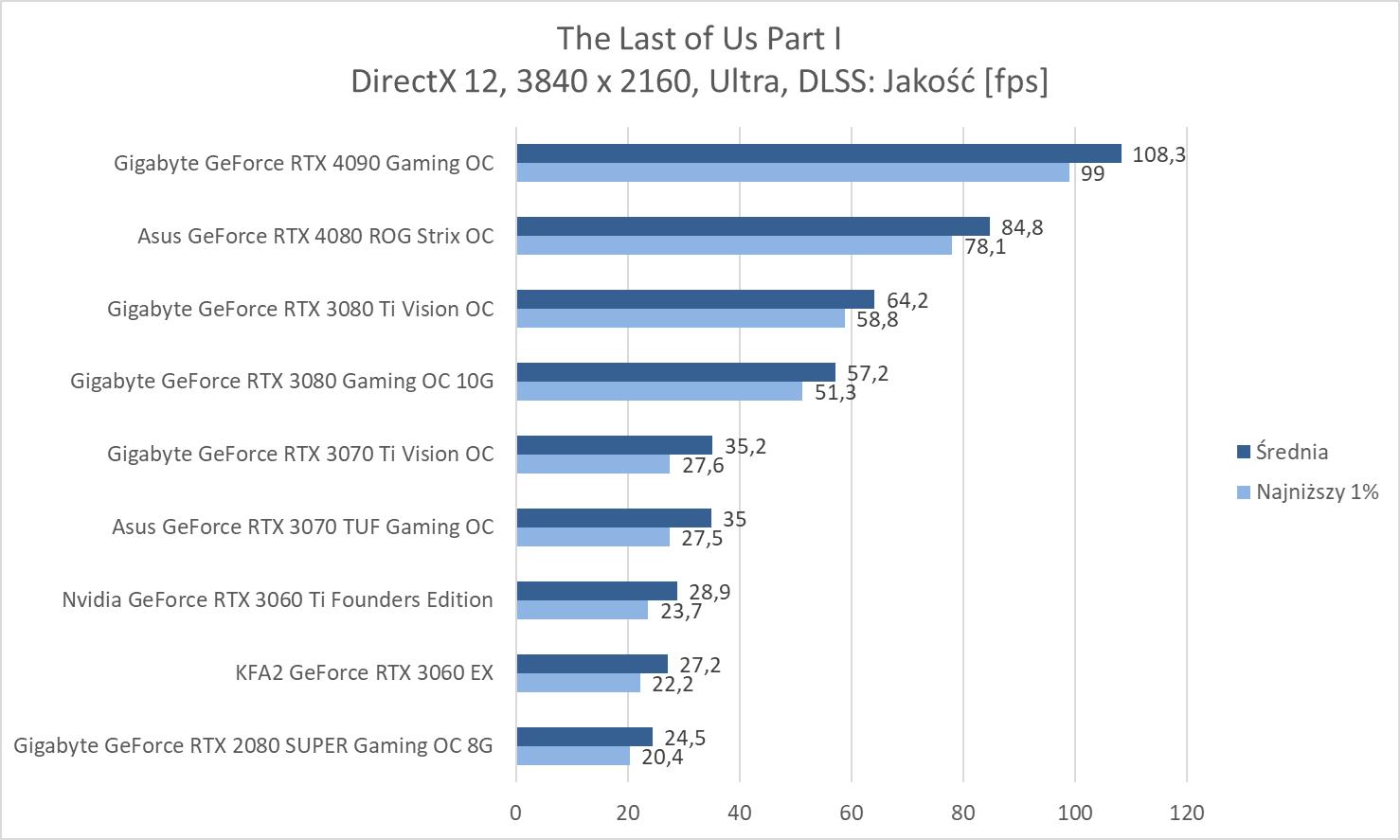 The Last of Us Part I to bardzo wymagający tytuł, co świetnie widać po wynikach. Mimo braku ray tarcingu, bez DLSS w 3840 x 2160 przy ustawieniach Ultra średnio 60 fps uzyskacie tylko na RTX 4090. Jest to naprawdę fatalna optymalizacja i nic nie tłumaczy aż takich wymagań. DLSS będzie więc obowiązkowy przy większości kart, aby uzyskać w pełni płynną rozgrywkę w szczególności w najwyższej z rozdzielczości.