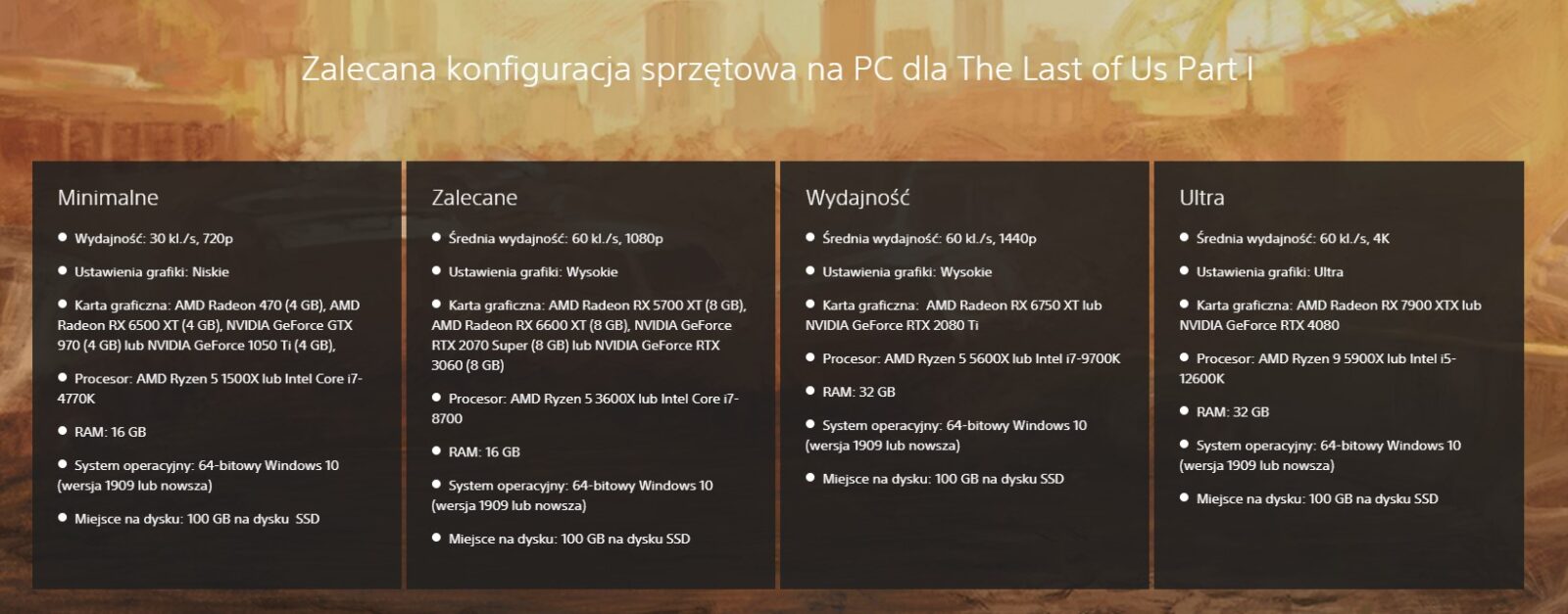 Minimalne wymagania pozwalają na grę w 720p przy 30 fps i ustawieniach niskich. GTX 1050 Ti czy i7-4770K nie są dużymi wymaganiami, ale taka rozgrywka mało kogo będzie satysfakcjonowała. Ustawienia zalecane to już rozgrywka w 60 fps 1080p przy ustawieniach wysokich. Tutaj potrzeba GeForce RTX 2070 SUPER lub RTX 3060 8 GB. Procesor to przynajmniej Ryzen 5 3600X lub i7-8700. Takie wymagania pokazują już, że gra naprawdę potrzebuje mocnego sprzętu. Na samym końcu są ustawienia Ultra pozwalające na grę w 60fps przy rozdzielczości 3840 x 2160 i ustawieniach Ultra. Tutaj musicie mieć Radeona RX 7900 XTX lub GeForce RTX 4080. Procesor nie musi być za to topowy, bowiem wystarczyć ma Ryzen 9 5900X lub i5-12600K. Warto też zwrócić uwagę na 32 GB pamięci RAM, która jest tutaj wymagana do grania. Gra zajmuje też 100 GB miejsca na dysku, więc tutaj niezależnie od ustawień musicie zapewnić taką przestrzeń.