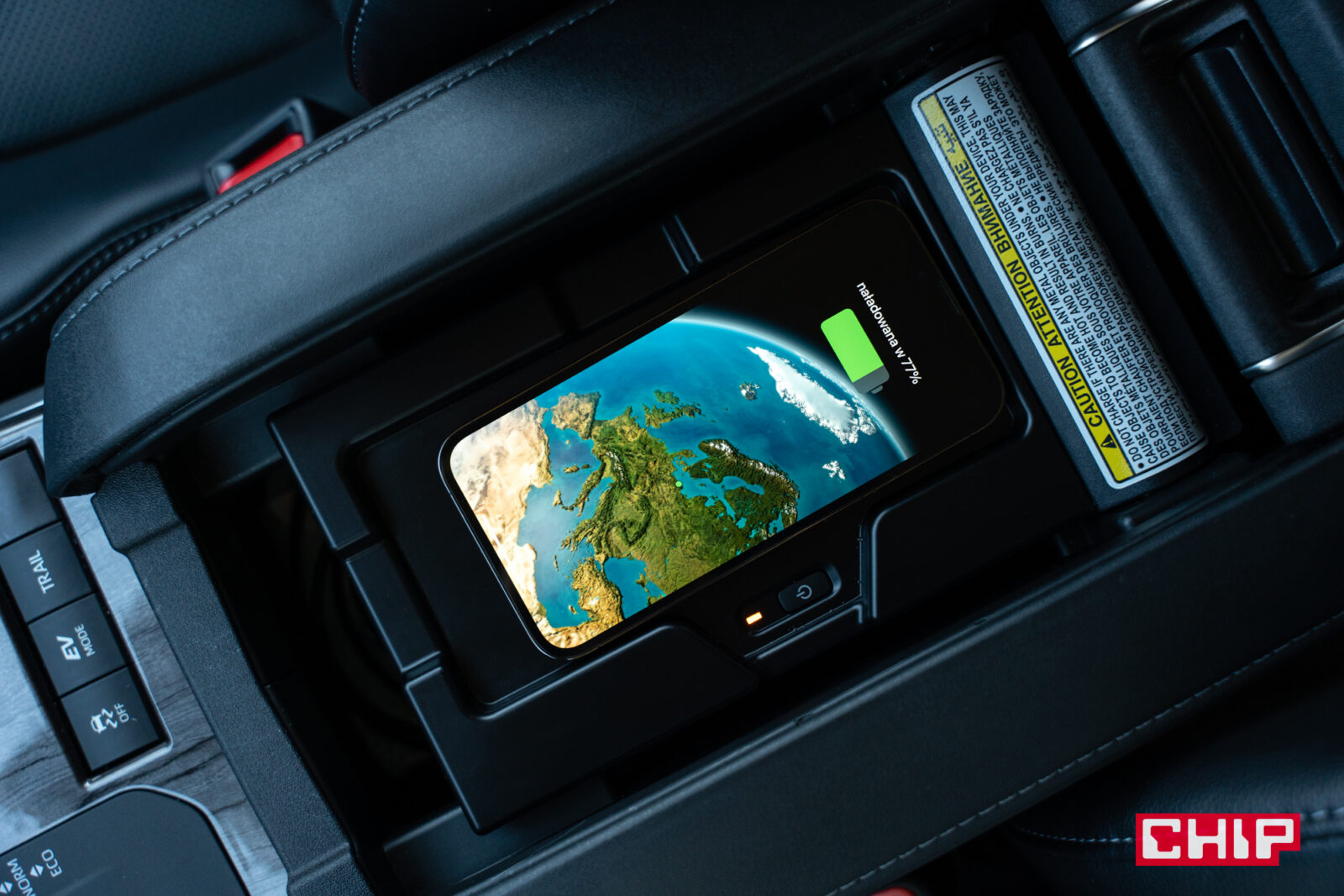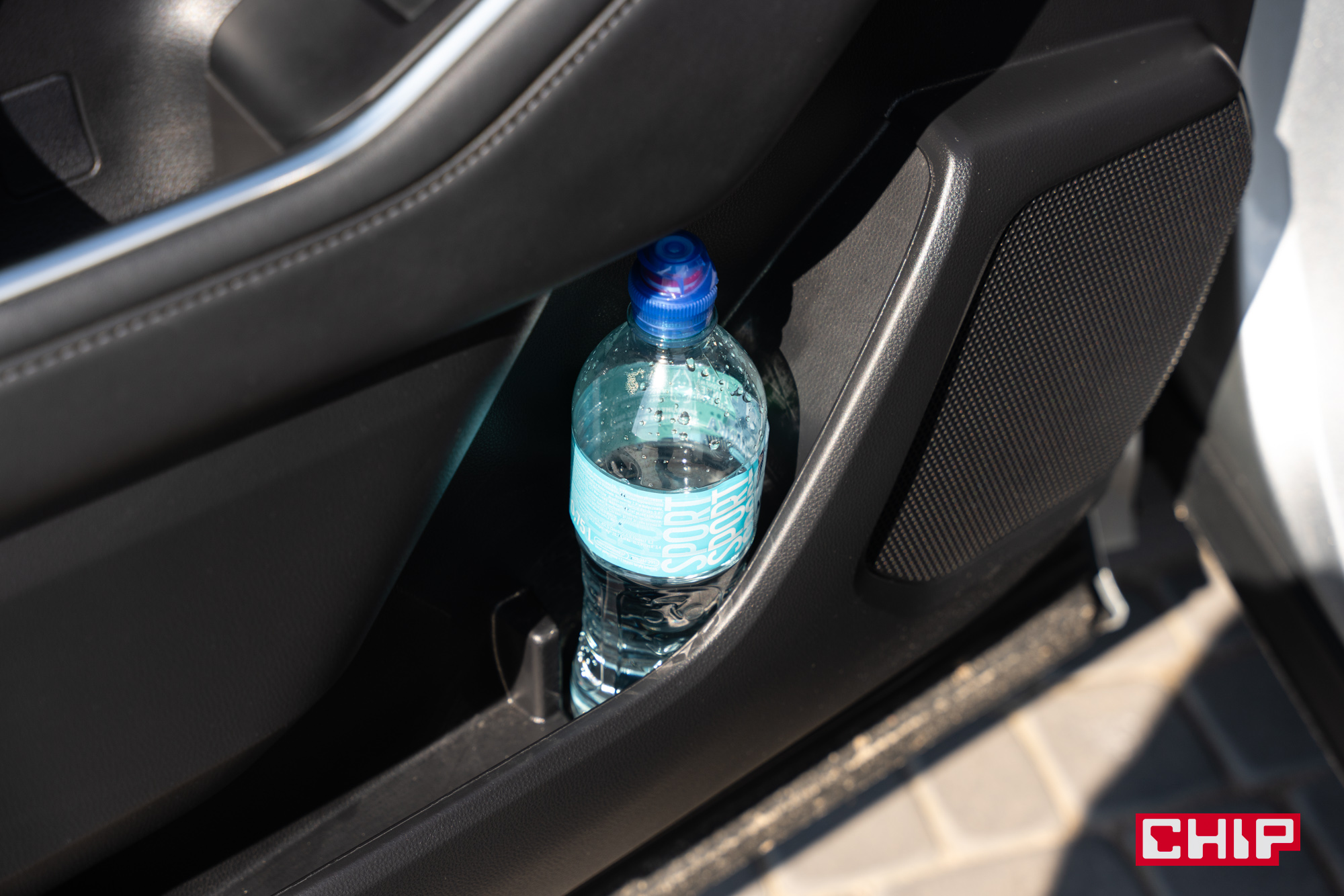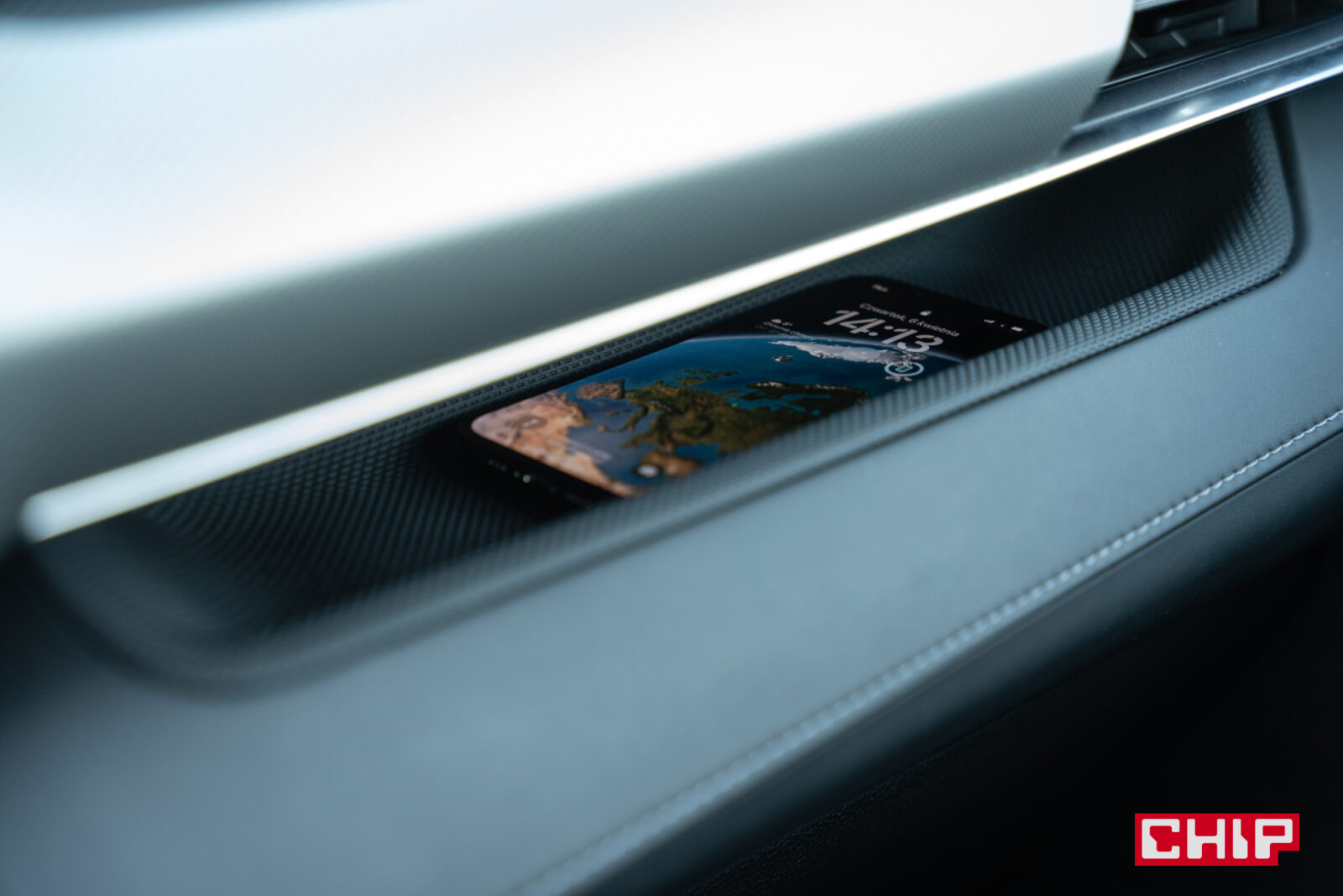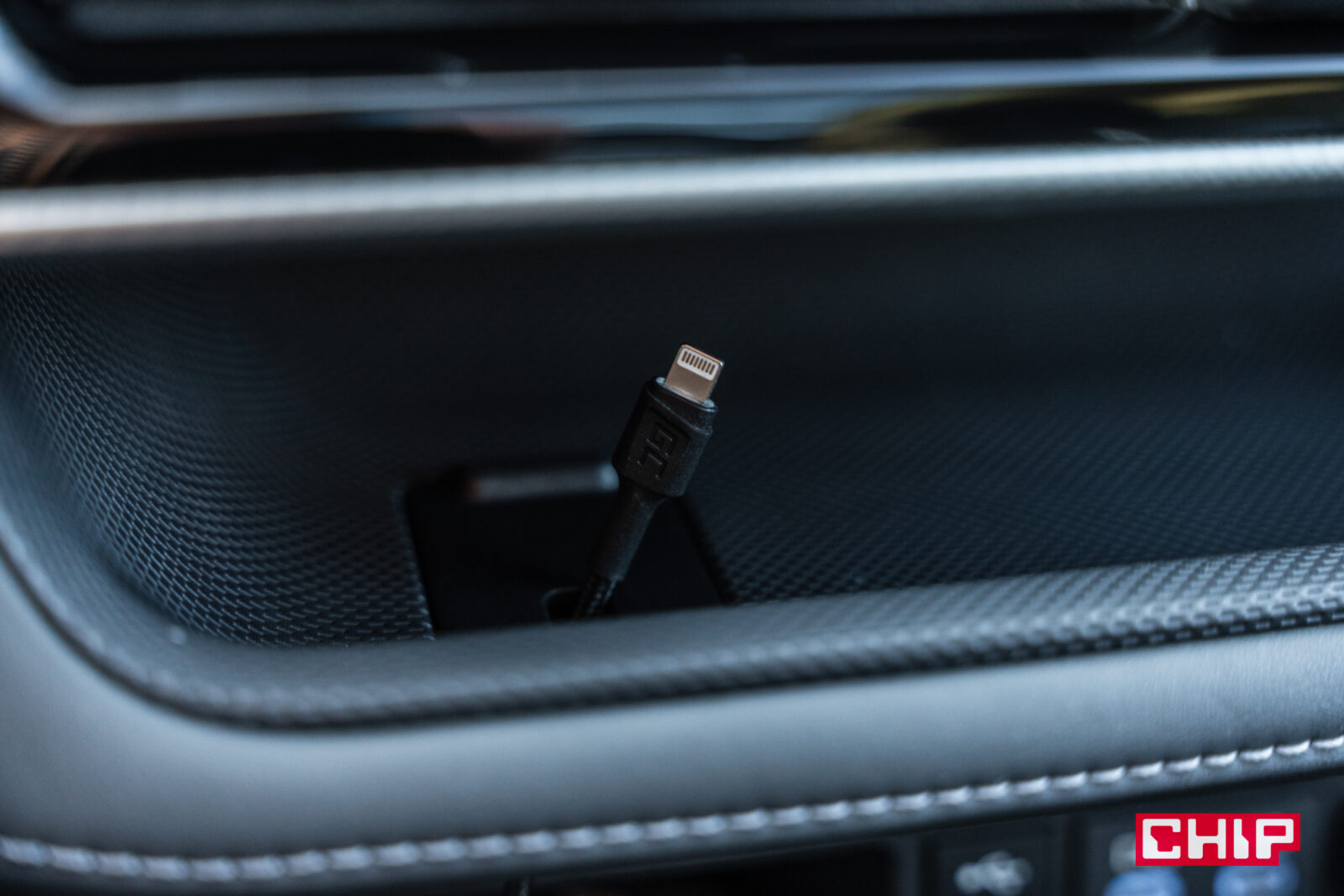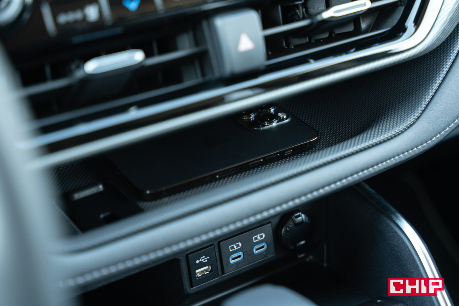 Do tego mamy istną feerię schowków i schoweczków, oraz dwie półki na smartfon – w konsoli środkowej i przed fotelem pasażera. Półka bliżej kierowcy ma też przepust na kabel i przez większość czasu jest świetnym rozwiązaniem… dopóki nie przyspieszymy zbyt gwałtownie. Wówczas telefony leżące na półeczce bez etui mają tendencję do wyfruwania z tych półeczek, mimo delikatnego zagięcia na krawędziach, które powinno temu zapobiec. Co najmniej trzykrotnie łapałem lecącego iPhone’a, a potem nauczyłem się go odkładać w inne miejsce, jeśli tylko nie był podłączony kablem.
