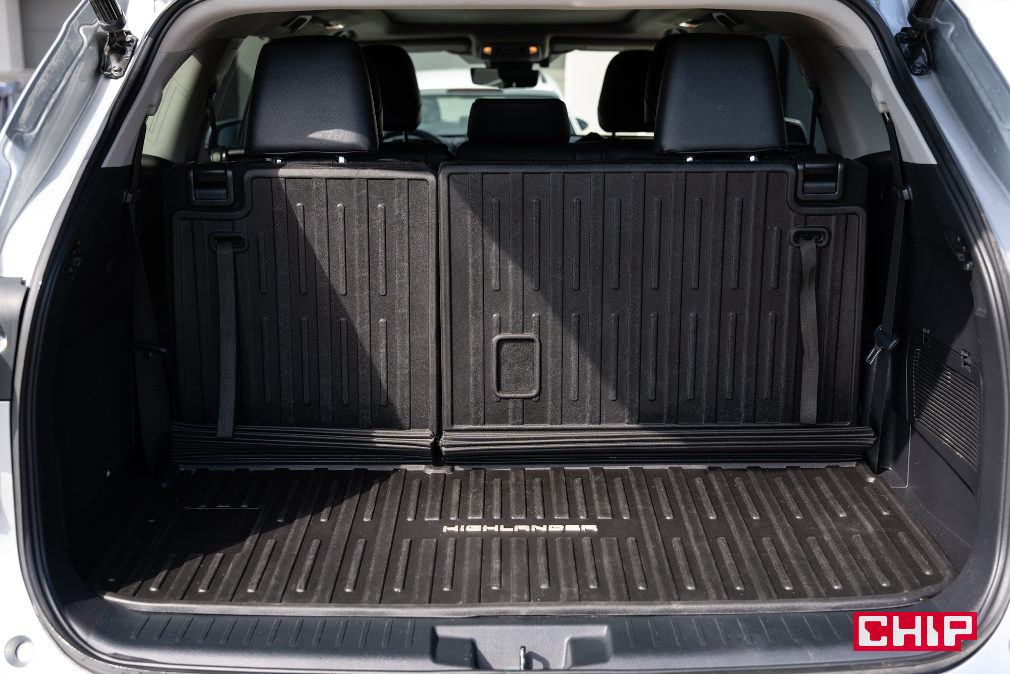 Po złożeniu ostatniego rzędu siedzeń dostajemy zaś przeogromną przestrzeń, która według specyfikacji producenta liczy 865l… do linii dachu. Jak widać Toyota podpatrzyła co nieco od Tesli, ściemniającej w ten sam sposób pojemność bagażnika modelu Y, podczas gdy realna pojemność jest znacznie mniejsza. Jednak nawet licząc do linii okien bagażnik Toyoty Highlander liczy bardzo „zdrowe” 658 litrów, a co ważniejsze – jest to przestrzeń bardzo ustawna, pozbawiona skosów pożerających pojemność, jak we wspomnianej Tesli.