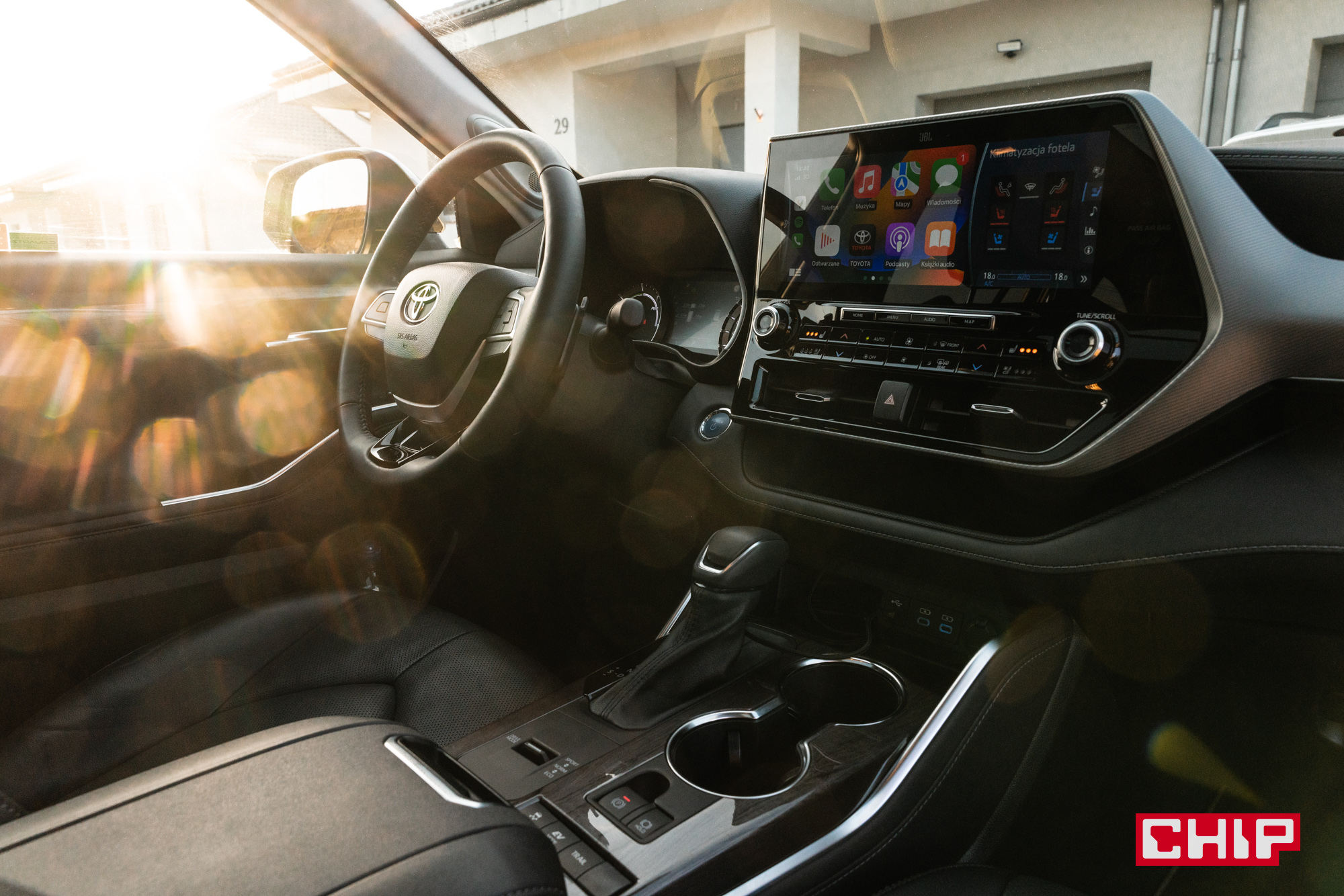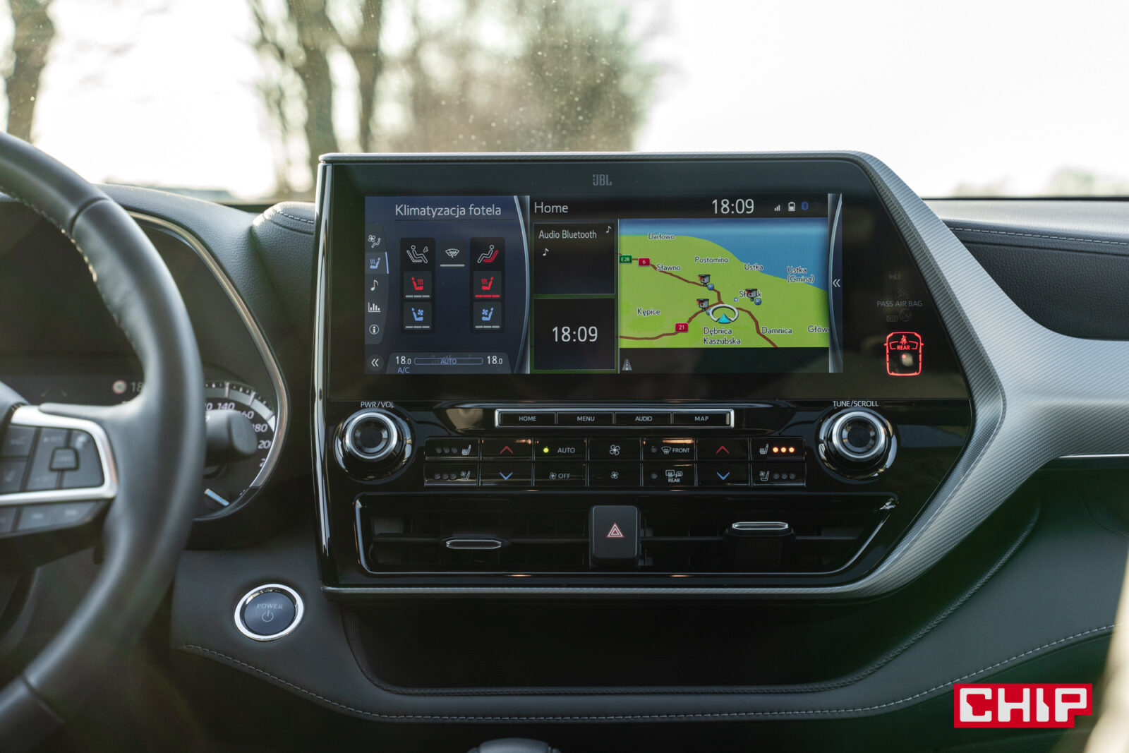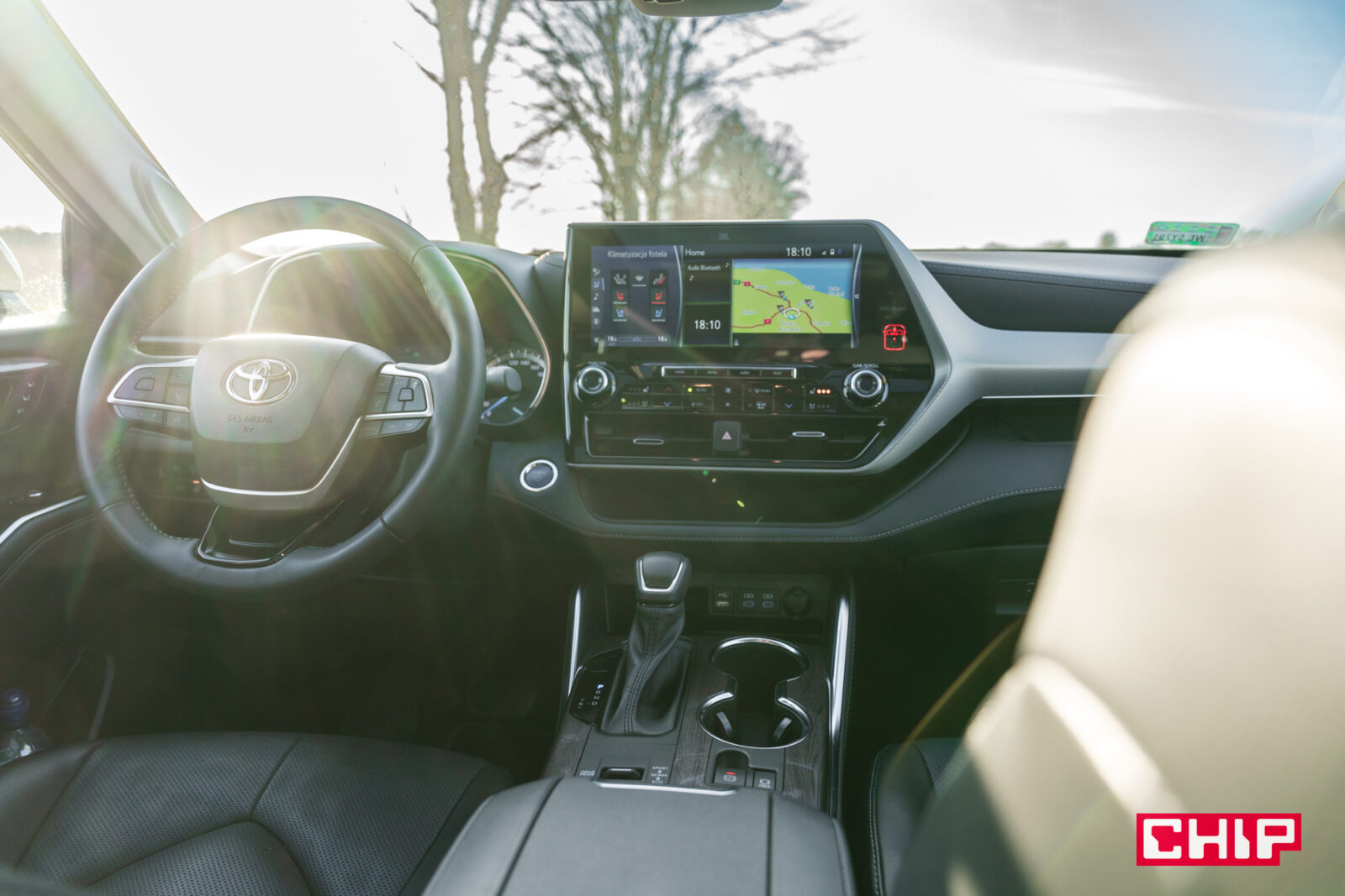Highlander na pewno zasługuje za to na pochwałę za wszechobecne przyciski. Wszystkie kluczowe funkcje, do których sięgamy po wielokroć każdego dnia – klimatyzacja, podgrzewanie/wentylowanie foteli, przełączanie menu, etc. – mamy dostępne pod ręką w formie przełączników na tyle dużych, że łatwo w nie trafić nawet w czasie jazdy i to nosząc rękawiczki. Dobrze, że tego modelu nie dopadła jeszcze głupia moda na obsługę wszystkiego ekranem czy przyciskami pojemnościowymi, co jest nie tylko niewygodne, ale też niebezpieczne w czasie jazdy.