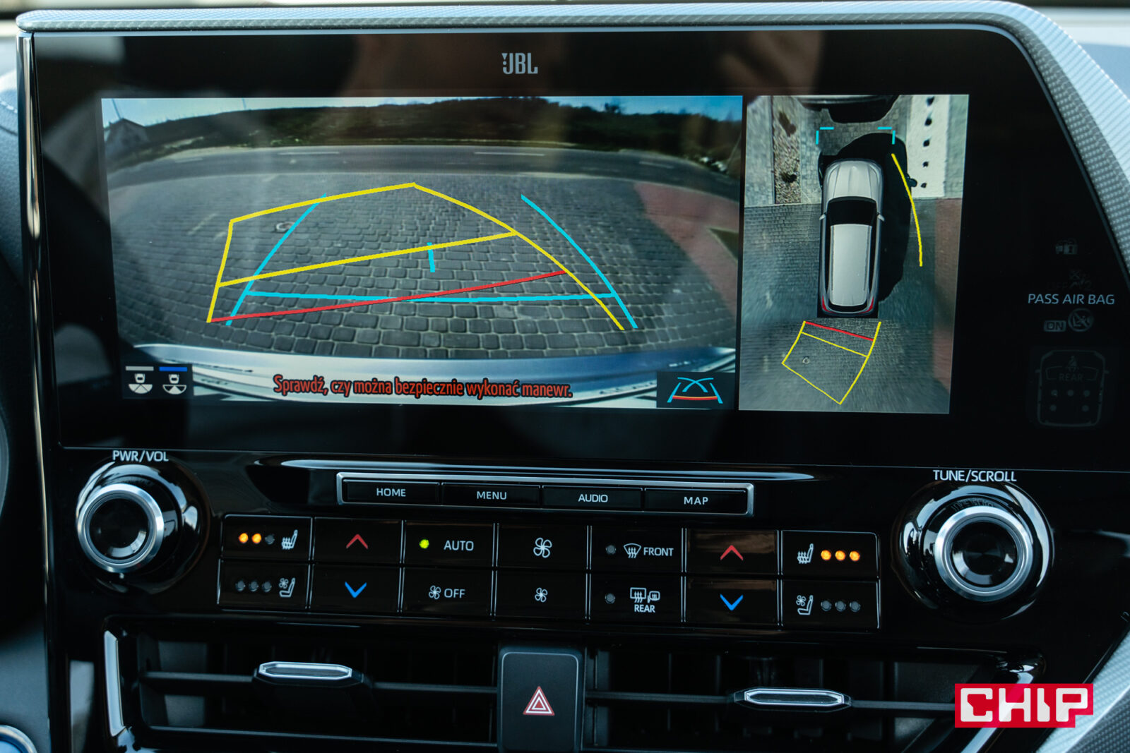 Najbardziej widać to przy kamerach; na miłość boską, czy linie pomocnicze czujników parkowania malował 6-letni syn inżyniera? One nawet nie są równe! I halo, droga Toyoto, kamerki o rozdzielczości 360p (bo raczej nie wyższej) są delikatnie rzecz ujmując nieakceptowalne w aucie tego kalibru. Mówiąc wprost, jedyny użyteczny widok kamer to widok 360 stopni, bo obraz z pozostałych kamer ma rozdzielczość kalkulatora i jest po prostu fatalny.
