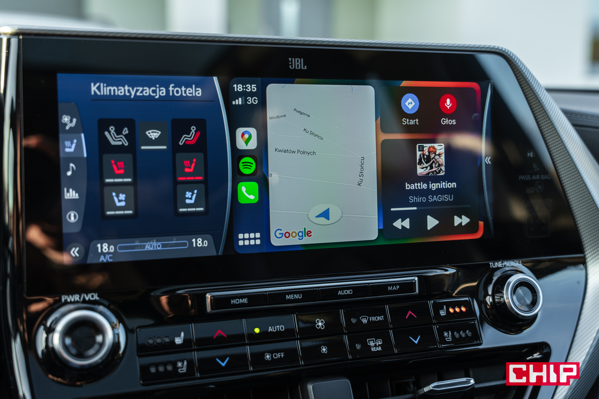 Szkoda tylko, że niezależnie od konfiguracji 12,3-calowego wyświetlacza interfejs smartfona zajmuje góra 2/3 powierzchni ekranu. Do tego Toyota uparcie zapominała, że ustawiłem domyślne przełączanie się na CarPlay po podłączeniu telefonu, więc za każdym razem wsiadając do auta musiałem przeklikać się przez menu, by włączyć smartfonowy interfejs.