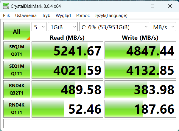 - CrystalDiskMark: 5241 MB/s odczyt sekwencyjny / 4847 MB/s zapis sekwencyjny