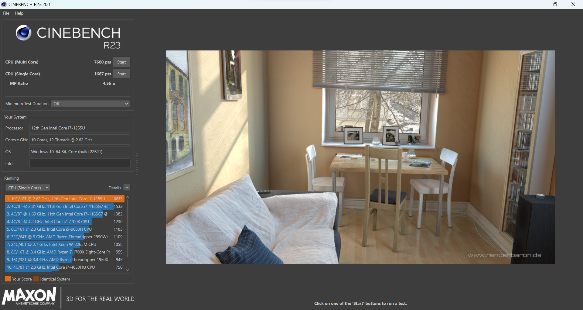 - Cinebench R23: 7680 pkt CPU Multi Core / 1687 CPU Single Core