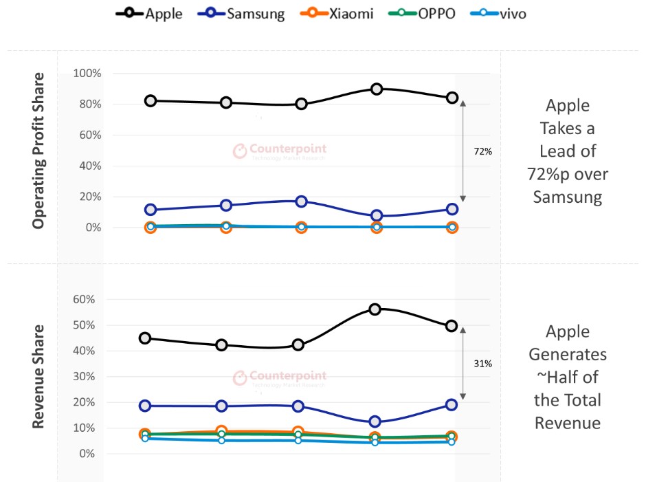 Kwartalne zestawienia (z kilkoma wyjątkami) zawsze umieszczają tych dwóch gigantów na szczycie listy, jako mających największy udział w zyskach ze sprzedaży telefonów. Kolejność może być różna, w zależności od regionu lub premier w danym kwartale, ale dwa pierwsze miejsca zwykle zajmują właśnie te dwie firmy.