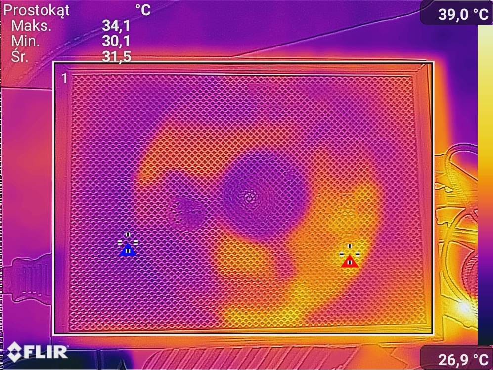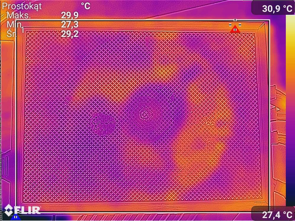 Spoczynek to wyświetlanie tylko pulpitu. Obciążeniem był FurMark oraz Cinebench R23. Zdjęcia termowizyjne wykonałem dzięki smartfonowi CAT S61. W testach włączyłem OCK.