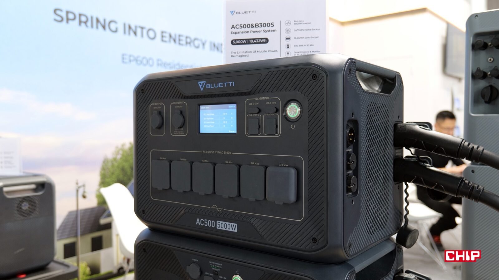 Urokiem wcześniej wspomnianego zestawu Bluetti EP600 jest jego skalowalność – możemy mieć tylko jeden bank energii B500 podpięty do zestawu, a gdy nasze potrzeby wzrosną, zdecydować się na więcej. To nie wszystko, bo Bluetti ma już w ofercie stacje energetyczne dla tych, którzy poszukują mniejszych i łatwiejszych do transportowania rozwiązań. Wśród nich zaprezentowana na stoisku stacja energii Bluetti AC500 o mocy znamionowej 5000W. Otrzymujemy po raz kolejny wspomniane przy innych sprzętach korzyści, jak zabezpieczenie UPS, wiele metod ładowania oraz bogaty zestaw złączy.