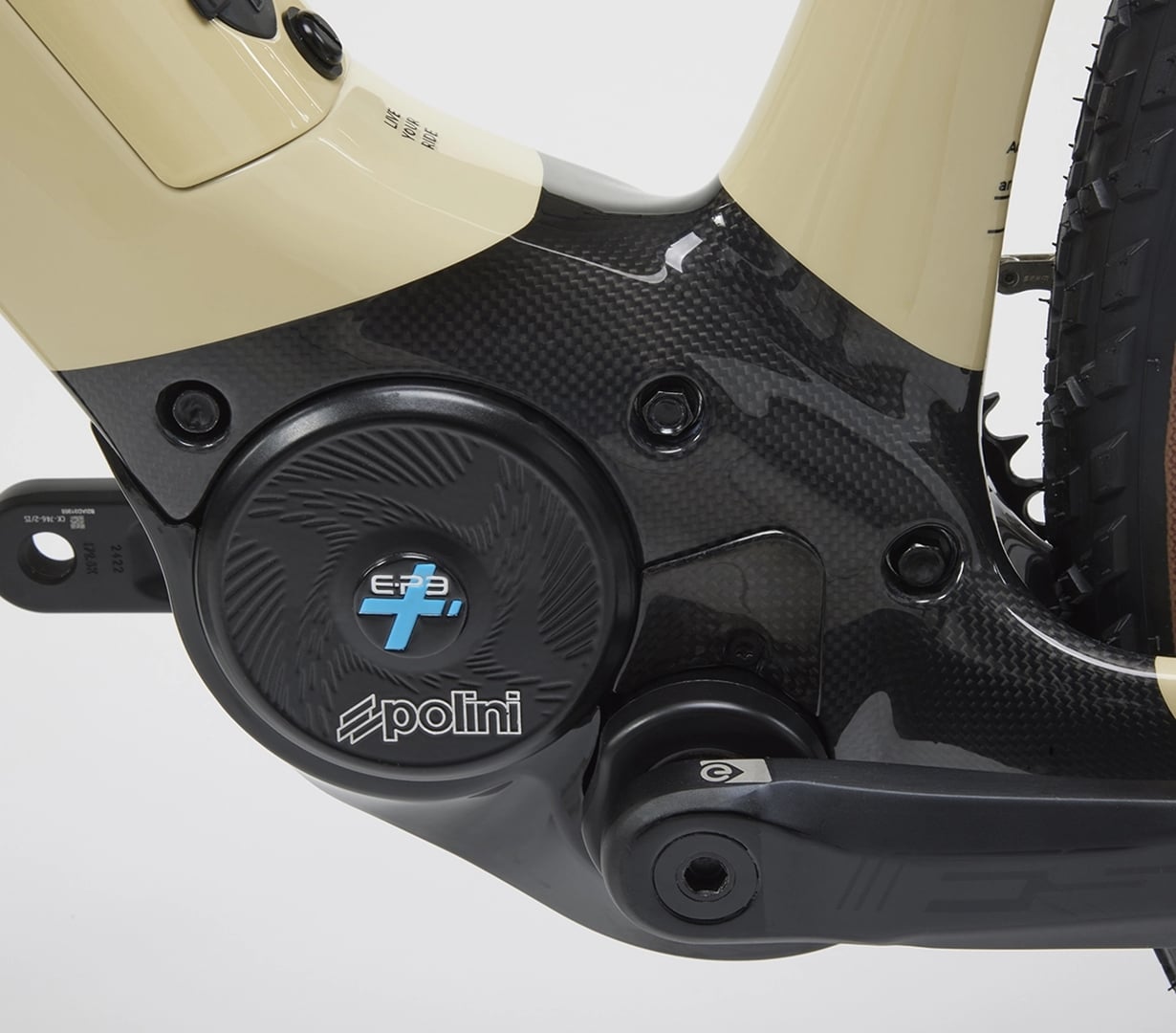 Na ciężar tego e-bike również trudno narzekać, o co zadbała 1,4-kilogramowa rama samonośna z włókna węglowego oraz równie zaawansowany widelec amortyzowany z technologią HiRide AR 1.5, która zapewnia 18-mm drogę pracy. Jego waga sięga z kolei 426 gramów, przez co zależnie od konfiguracji, finalna waga samego roweru sięga od 16,6 do 17 kilogramów zależnie od konfiguracji i rozmiaru ramy (dostępne XS, S, M, L oraz XL w trzech kolorach). W tej liczbie kryje się przede wszystkim zamontowany między korbami elektryczny silnik Polini EP3+ EVO o 250-watowej mocy nominalnej, 500-watowej mocy szczytowej i 70-Nm momencie obrotowym, który współpracuje z 500-Wh akumulatorem, zapewniającym zasięg do maksymalnie 220 kilometrów na jednym ładowaniu.