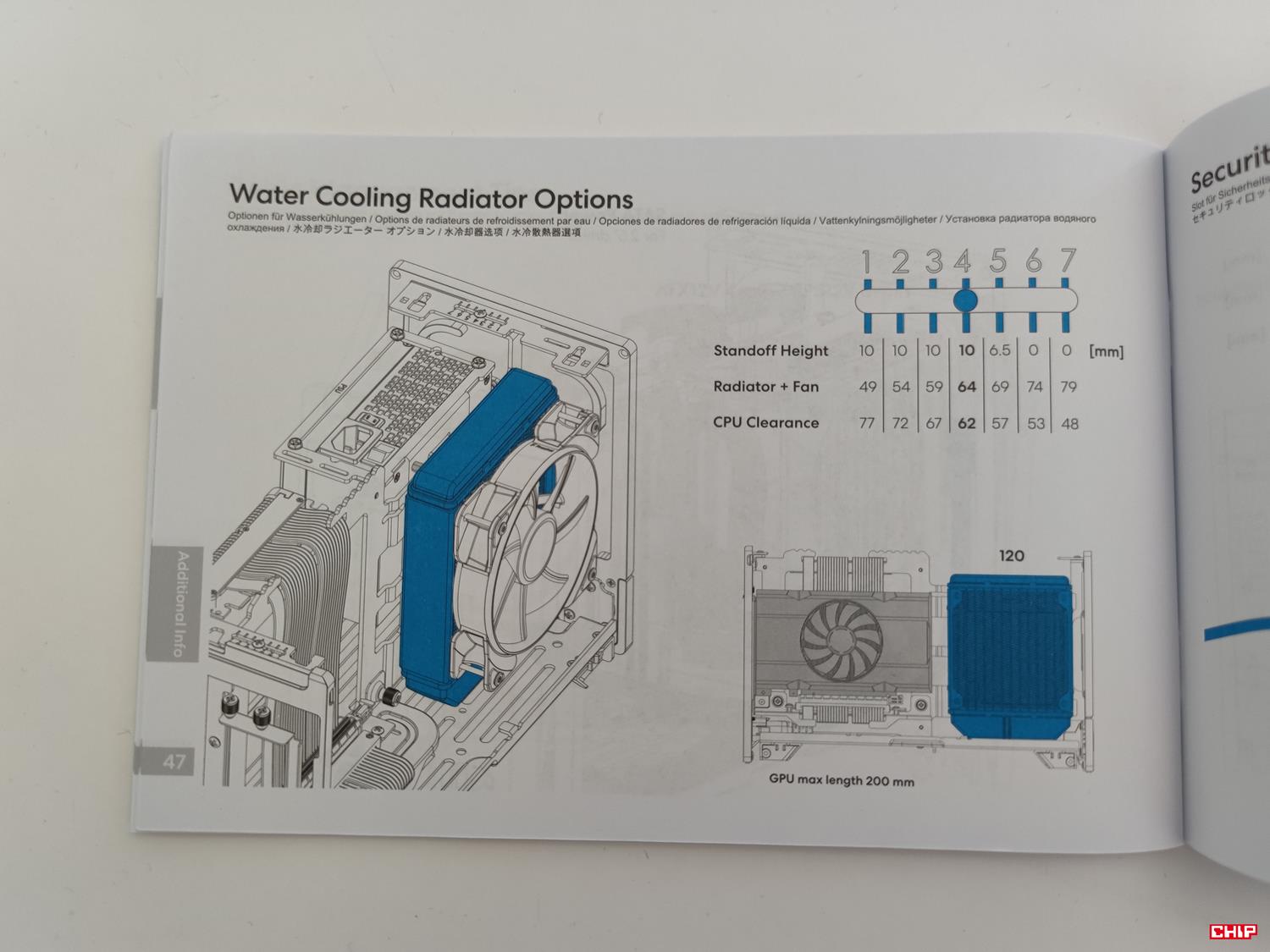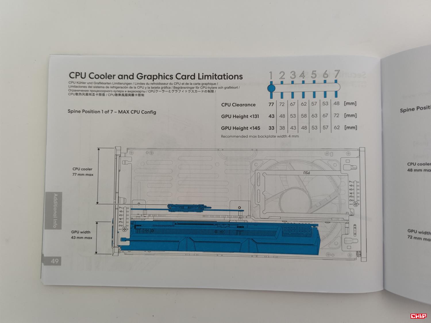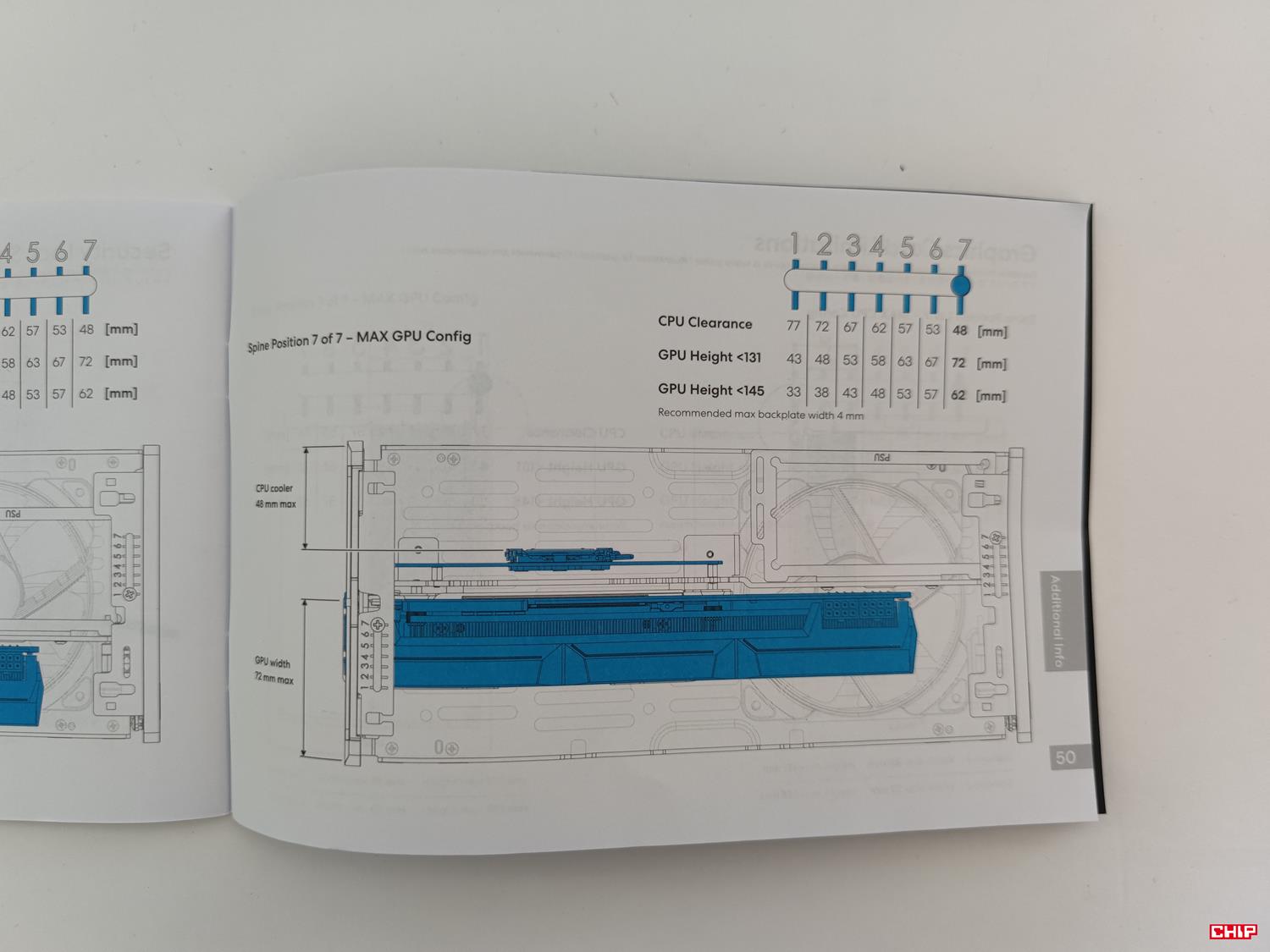 We wnętrzu możecie zobaczyć kilka ciekawych rzeczy. Po pierwsze mamy zmienną pozycję podstawki pod płytę. Domyślnie jest ona na poziomie 4, ale możemy ją zmieniać od 1 do 7. Jej położenie reguluje maksymalną wysokość chłodzenia oraz wymiary karty graficznej. Najlepiej prezentują to też zdjęcia z instrukcji.