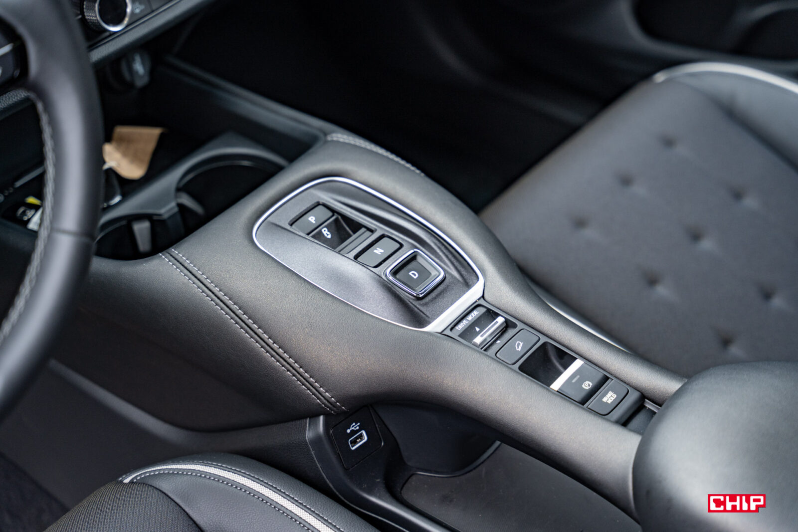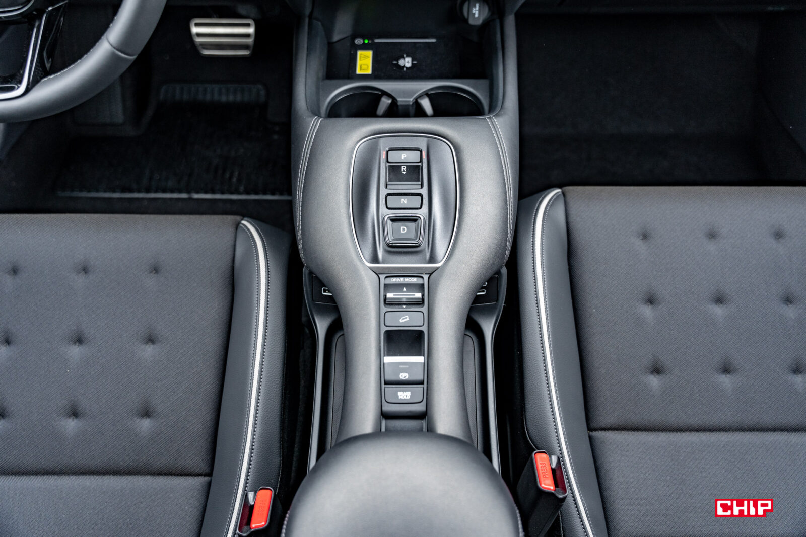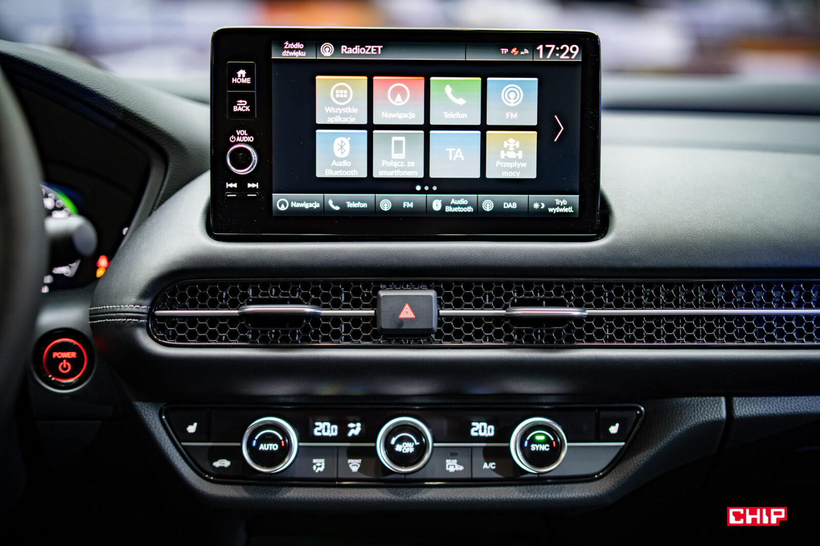 Wnętrze wyraźnie nawiązuje do Civica – układ przycisków, kratka na desce rozdzielczej, wyświetlacz… Tak, czuć tutaj Civica z kilometra. Bardzo dobrze, lubimy, wnętrze Civica. Jedynym elementem unikalnym dla ZR-V jest środkowy tunel – uchwyty na napoje przesunięto do przodu, a przyciski służące zmianie trybów jazdy ustawiono w jednym rzędzie, co pozwoliło na wyszczuplenie samego tunelu. Na pochwałę zasługuje też sprytne umieszczenie portów USB – po stronie kierowcy mamy jedno gniazdo USB pozwalające na łączność Android Auto (niestety, tylko po kablu), a po stronie pasażera – 2 porty USB typu C.