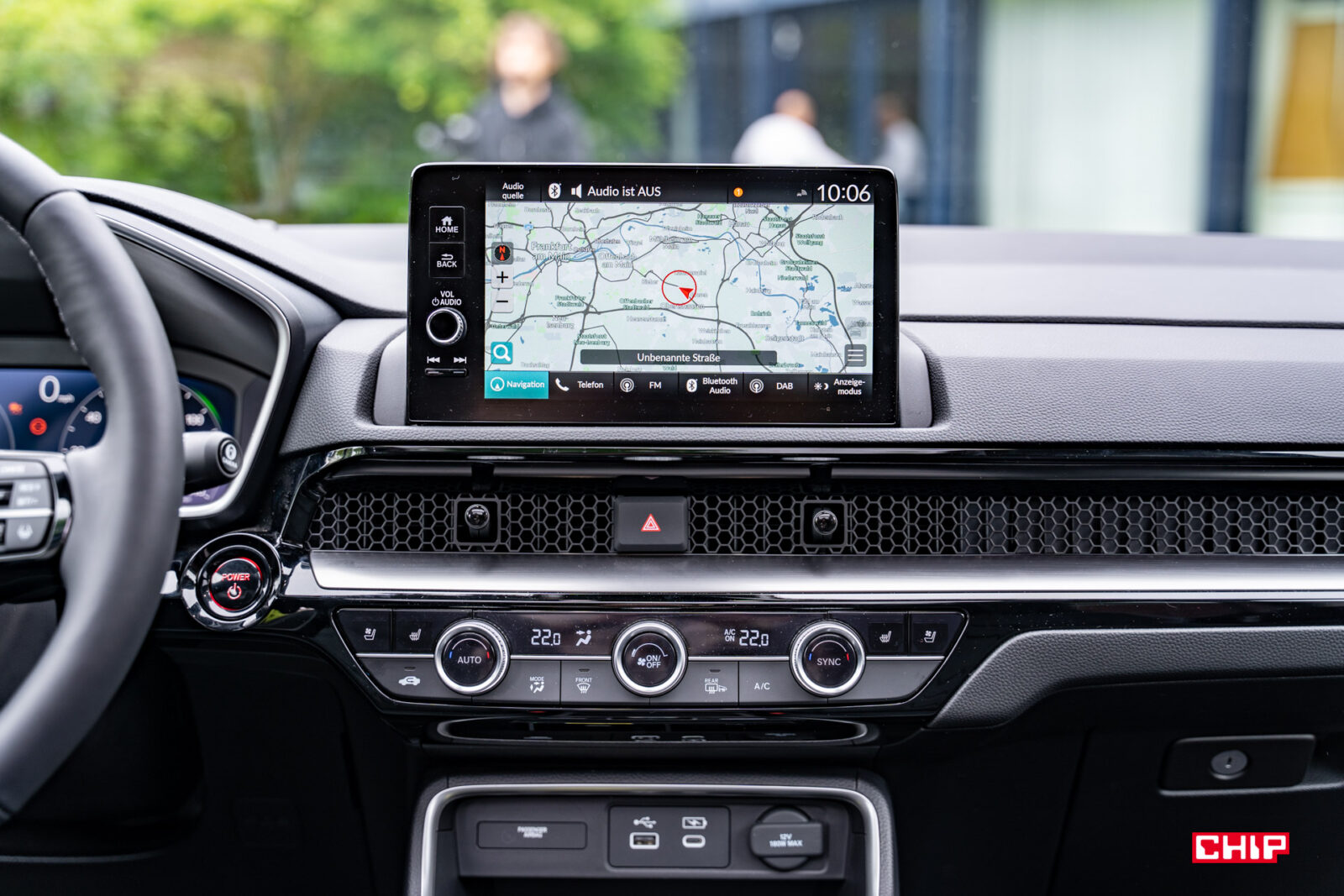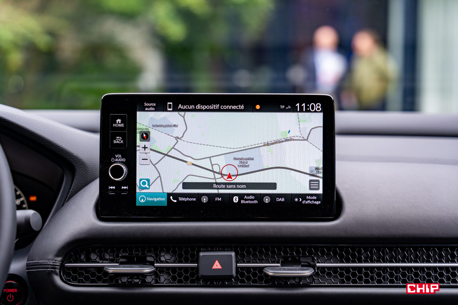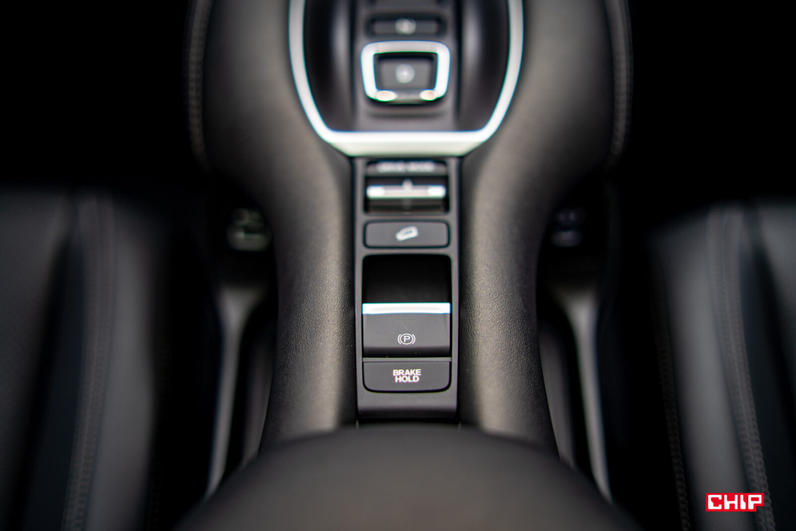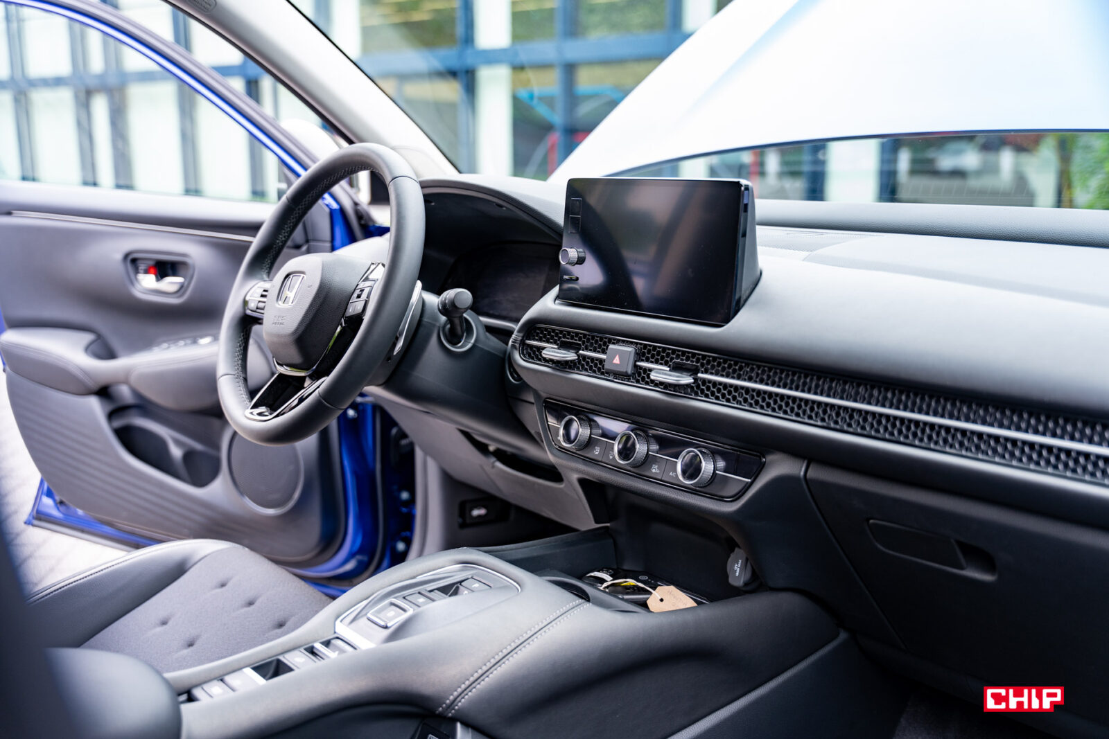 Wnętrze wyraźnie nawiązuje do Civica – układ przycisków, kratka na desce rozdzielczej, wyświetlacz… Tak, czuć tutaj Civica z kilometra. Bardzo dobrze, lubimy, wnętrze Civica. Jedynym elementem unikalnym dla ZR-V jest środkowy tunel – uchwyty na napoje przesunięto do przodu, a przyciski służące zmianie trybów jazdy ustawiono w jednym rzędzie, co pozwoliło na wyszczuplenie samego tunelu. Na pochwałę zasługuje też sprytne umieszczenie portów USB – po stronie kierowcy mamy jedno gniazdo USB pozwalające na łączność Android Auto (niestety, tylko po kablu), a po stronie pasażera – 2 porty USB typu C.