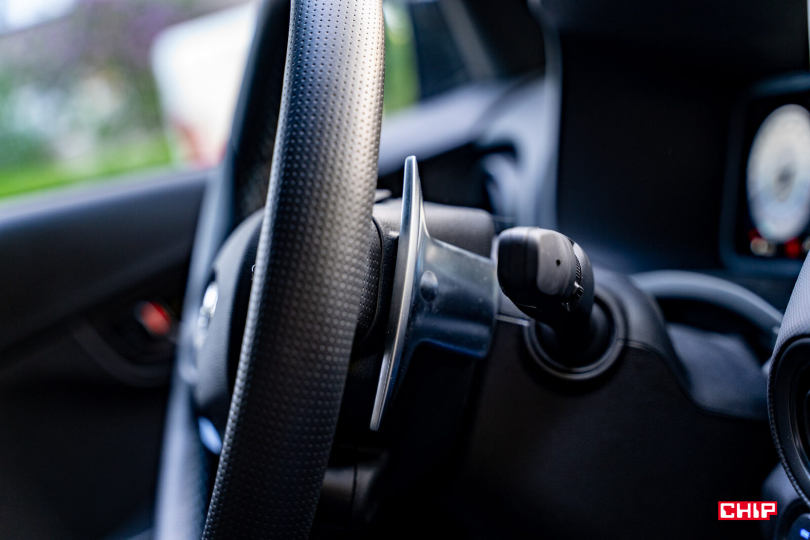 Do tego mamy bardzo dużo dodatków, które skutecznie nam przypominają, że jest to auto sportowe. Przede wszystkim jest to kierownica z dodatkowymi przyciskami, obszyta skórą z efektownym wzorze i taki sam znajdziemy na dźwigni zmiany kierunków jazdy.