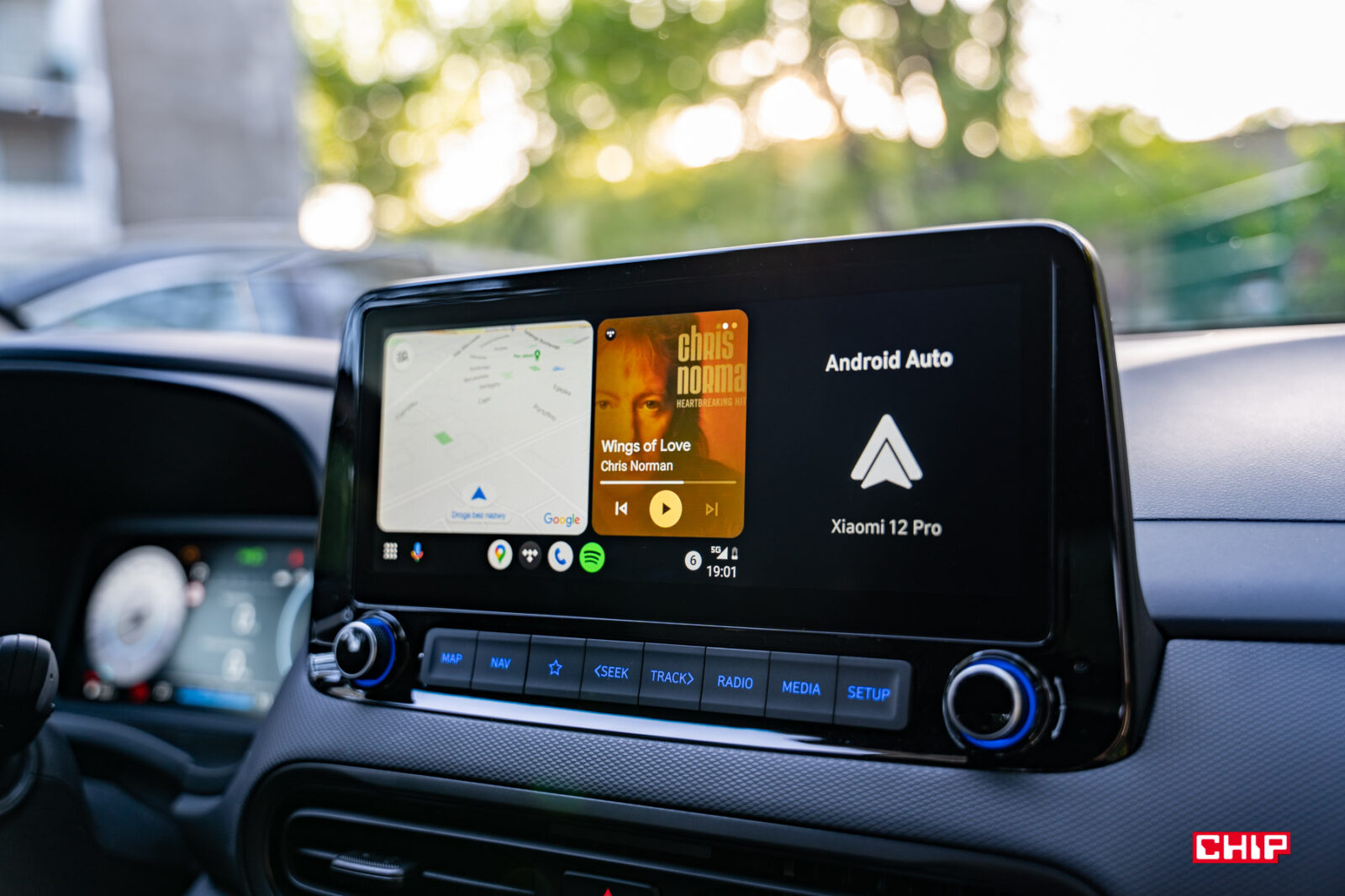 Kona N najwyraźniej nie została zaktualizowana do nowszej wersji oprogramowania, przez co po podłączeniu smartfonu w ramach Android Auto (po kablu) nie zajmuje on całego ekranu. Co prawda jest to już nowy interfejs systemu, ale 1/3 ekranu z prawej strony zajmuje nazwa naszego smartfonu. Tak w ramach przypomnienia, żebyśmy nie zapomnieli, z czego korzystamy. Kompletnie bez sensu i oby Kona N też doczekała się aktualizacji tego elementu. Kia już sobie poradziła z tą przypadłością w swoich autach.