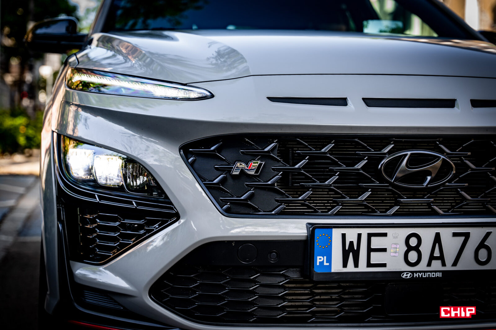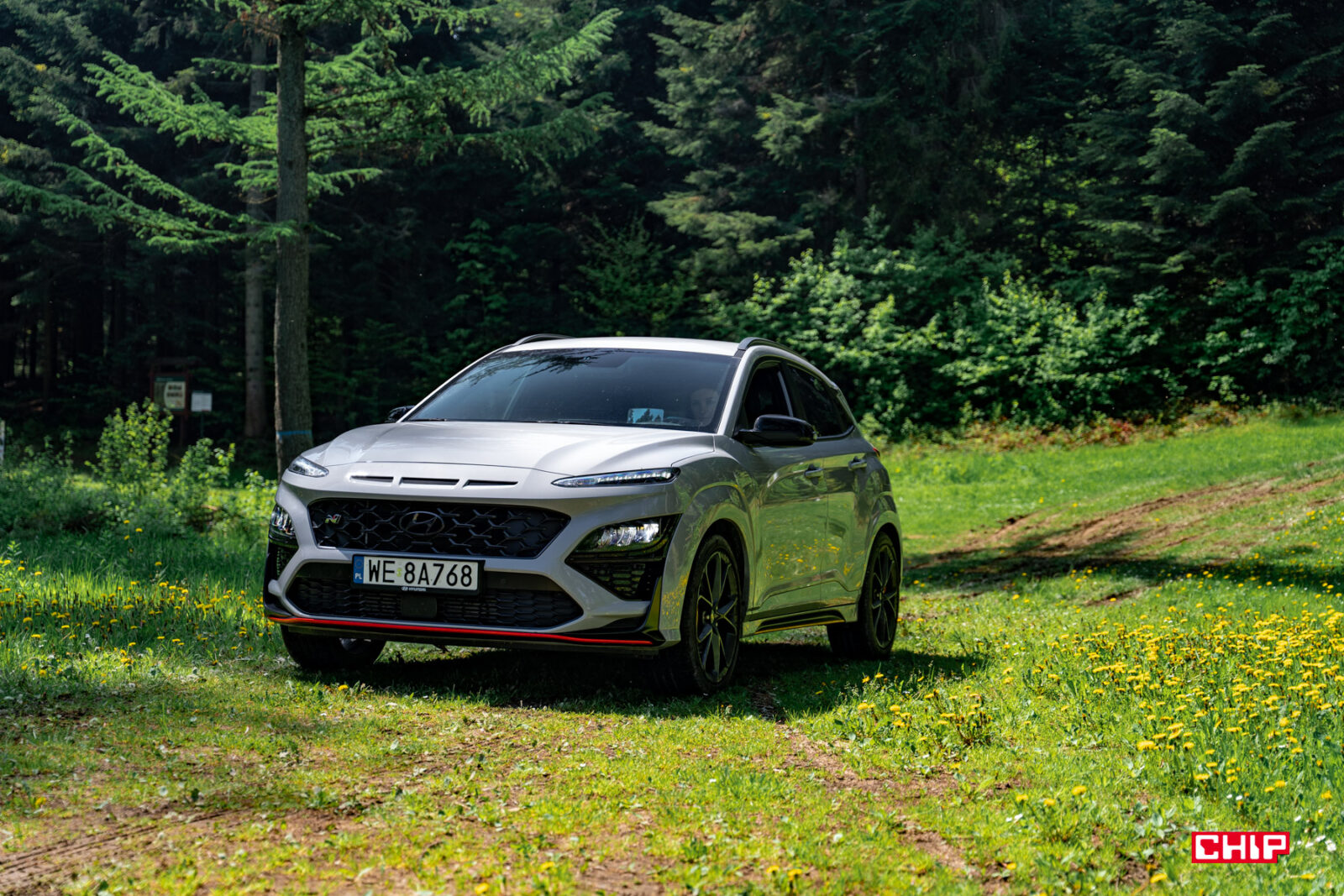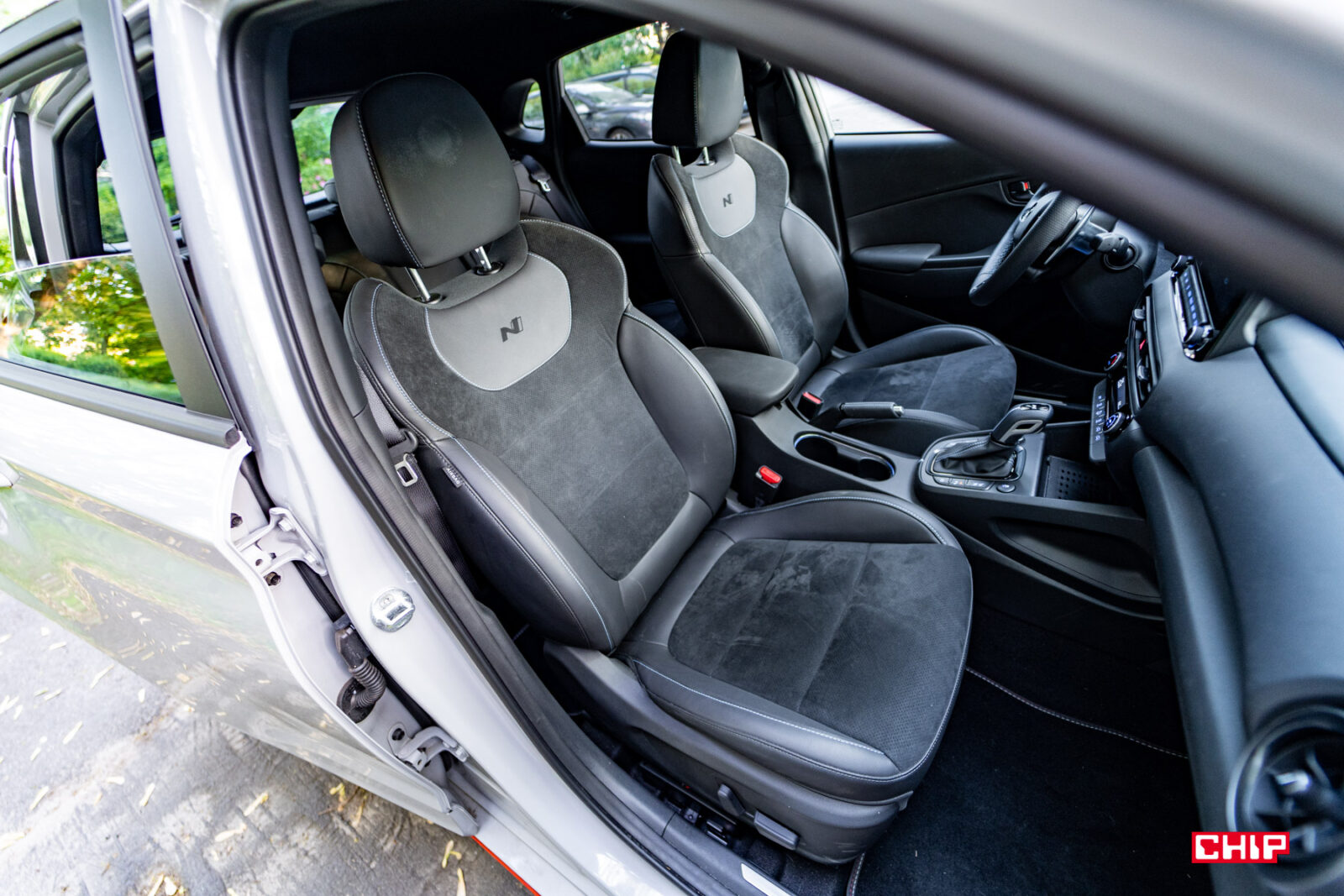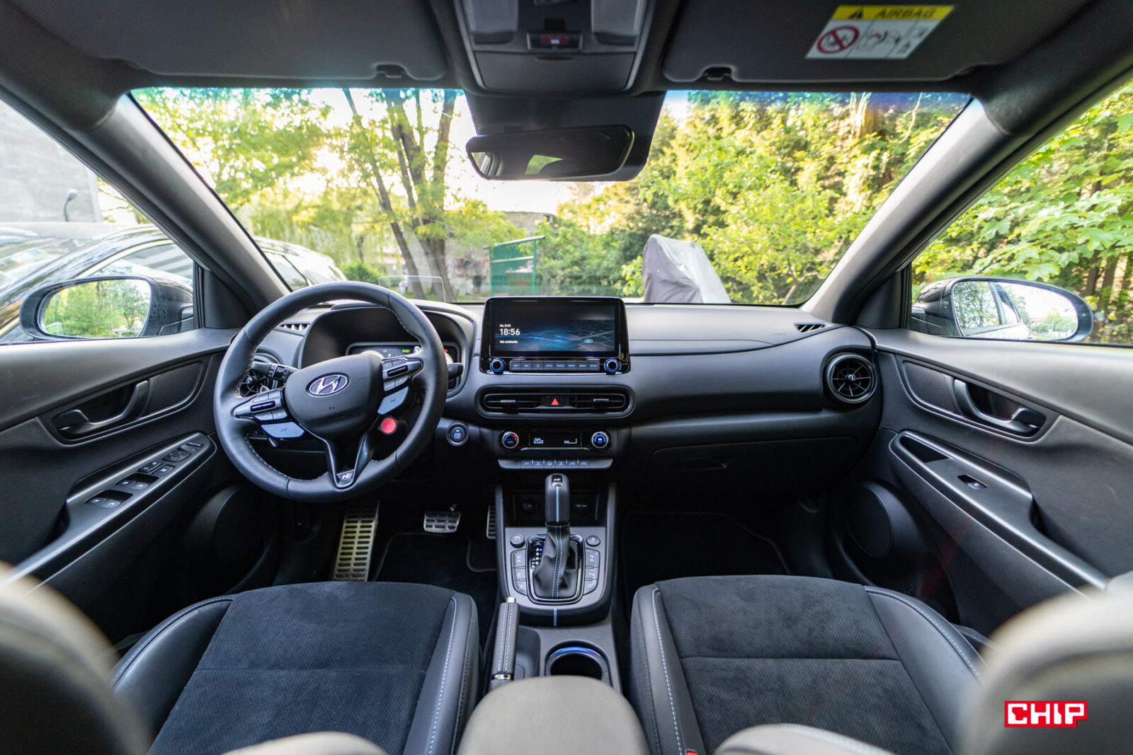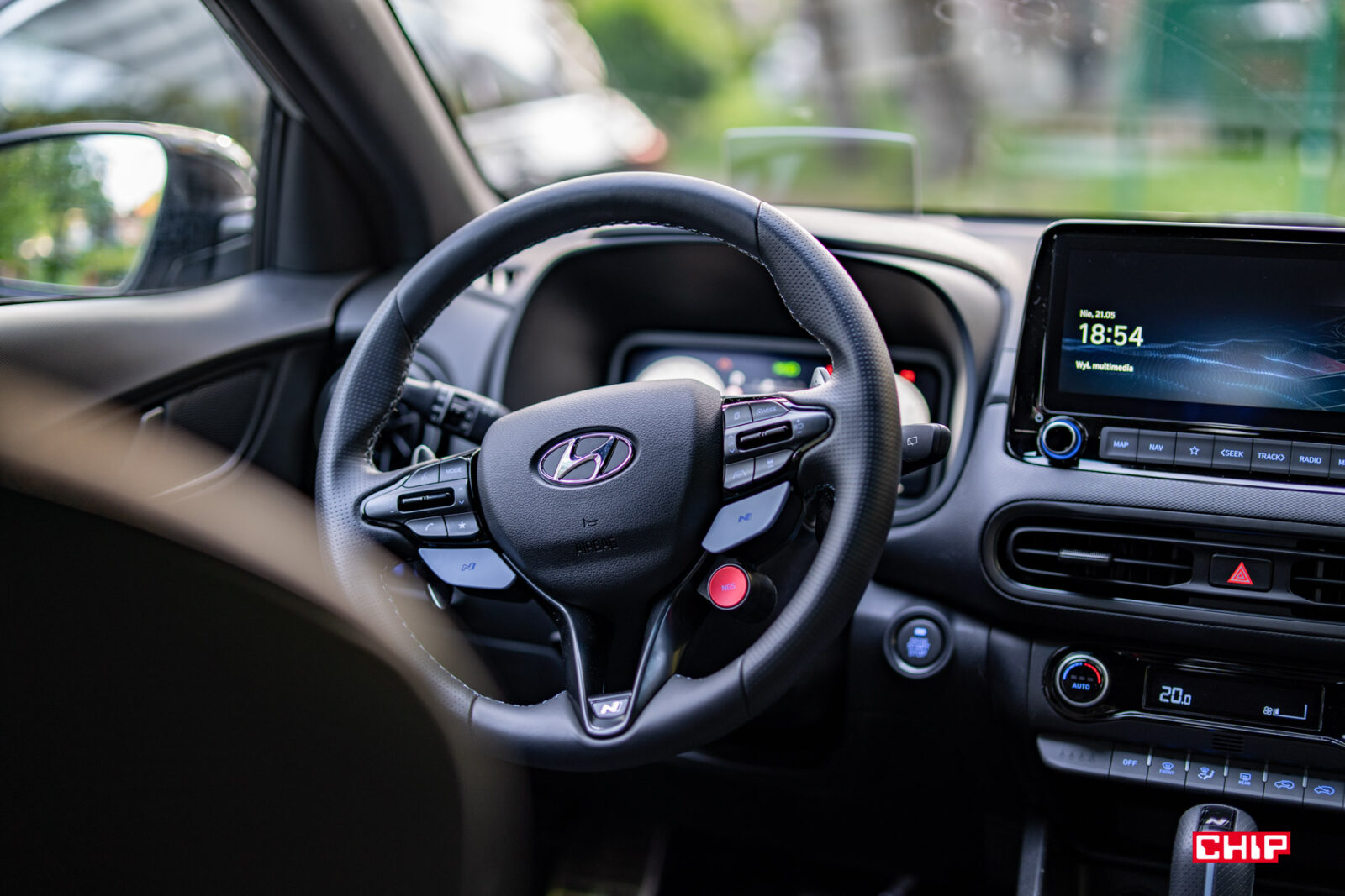 Drugim sportowym elementem są oczywiście kubełkowe fotele ze skórzanymi wstawkami i obowiązkowo logo N. Koną N jeździliśmy sporo po krętych drogach w Bieszczadach i przesiedliśmy się do niej z Dacii Jogger, gdzie trzymanie w fotelu praktycznie nie istniało. W Konie czułem się przyklejony do oparcia. Fotele świetnie trzymają w zakrętach, nawet podczas dynamicznej jeździe krętymi drogami, więc również podczas zabawy na torze będziecie czuć się bardzo pewnie. Co warto zauważyć, fotele nie są zbyt twarde i po 6-godzinnej trasie do wspomnianych Bieszczad moje plecy były w bardzo dobre kondycji.