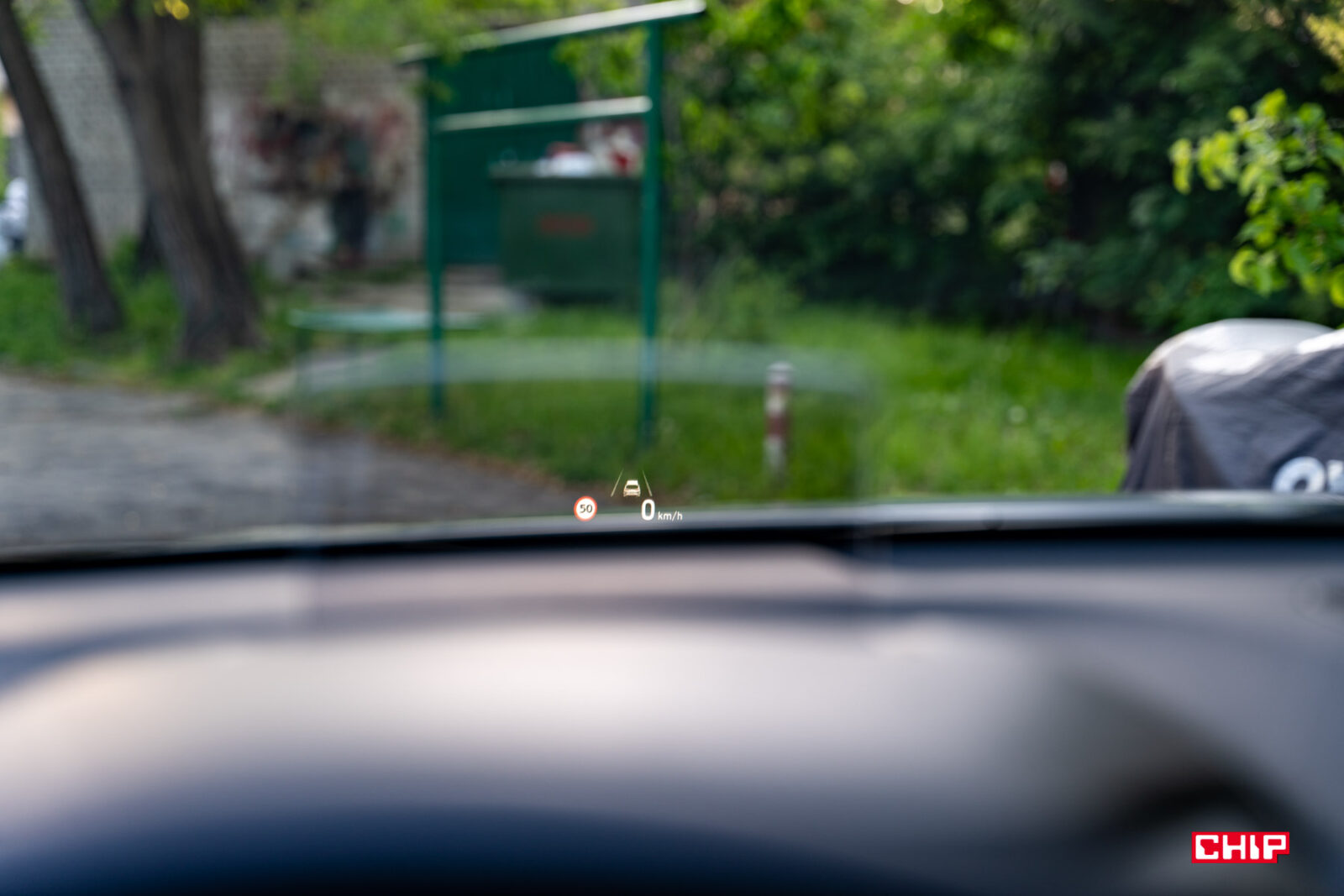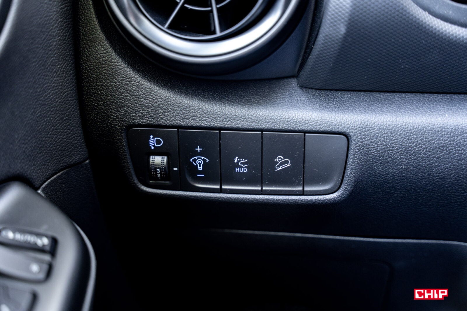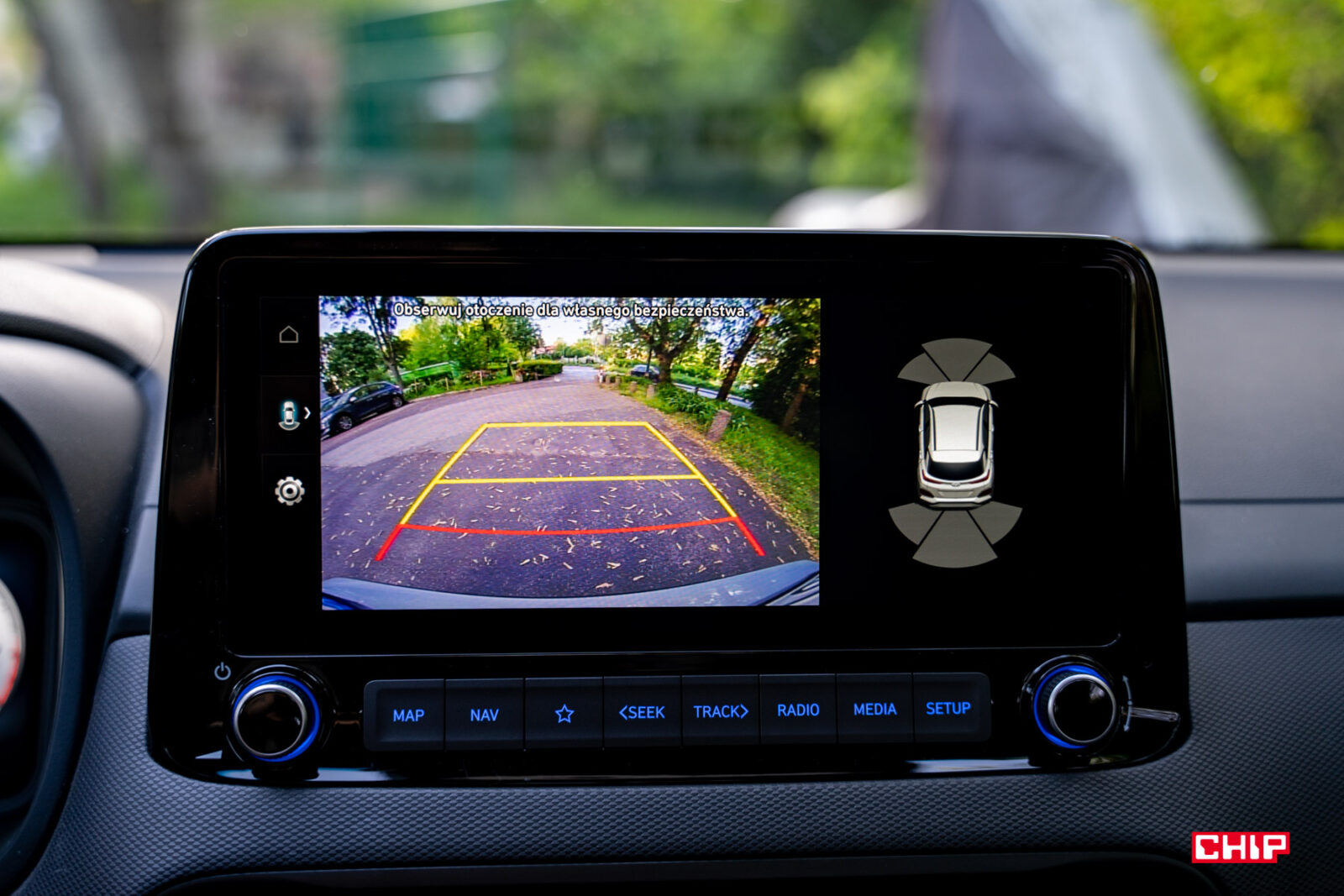 Kona N ma do dyspozycji wyłącznie kamerę cofania, bez opcji rozszerzenia jej o kamery 360 stopni. Obraz jest przyzwoitej jakości, ale kamera jest dosyć mocno na widoku i w deszczowe dni wymaga okazyjnego przetarcia. Head-up jest dostępny w formie podnoszonej szybki. Jeśli kogoś to razi, można go zamknąć jednym przyciskiem, ale jak zawsze powtarzam – lepiej bo mieć, niż nie mieć.