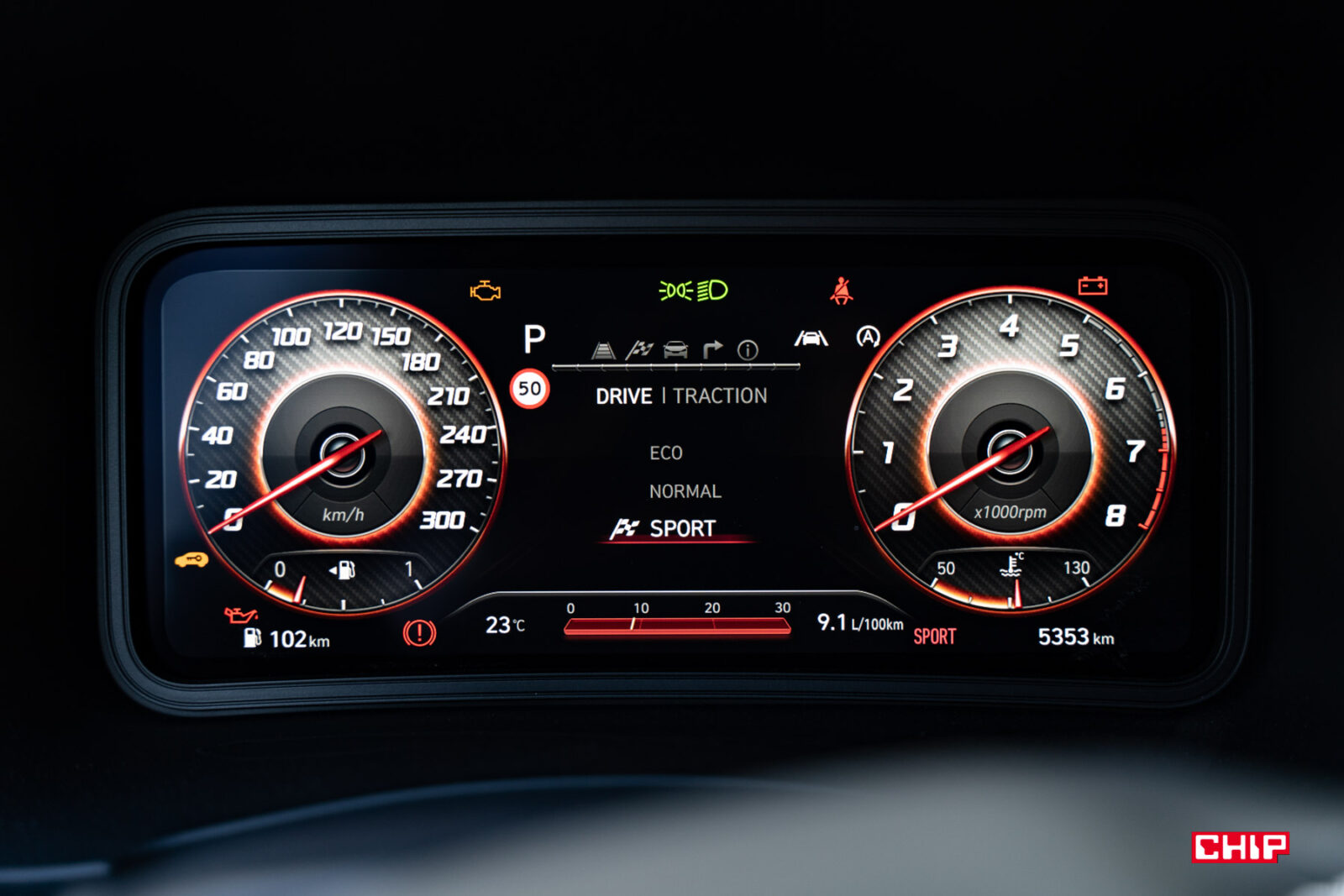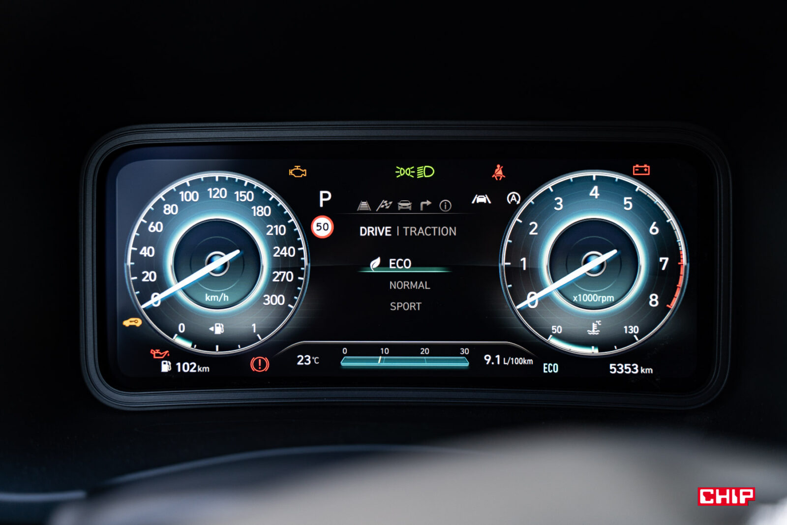 Wygląd ekranu kierowcy zmienia się wraz z wyborem trybu jazdy. Zmienia się grafika na zegarach oraz ich kolor, a pomiędzy nimi możemy wyświetlić interesujące nas opcje dodatkowe. Wygląd kompletnie zmienia się w sportowym trybie N, ale do tego elementu za moment przejdziemy.