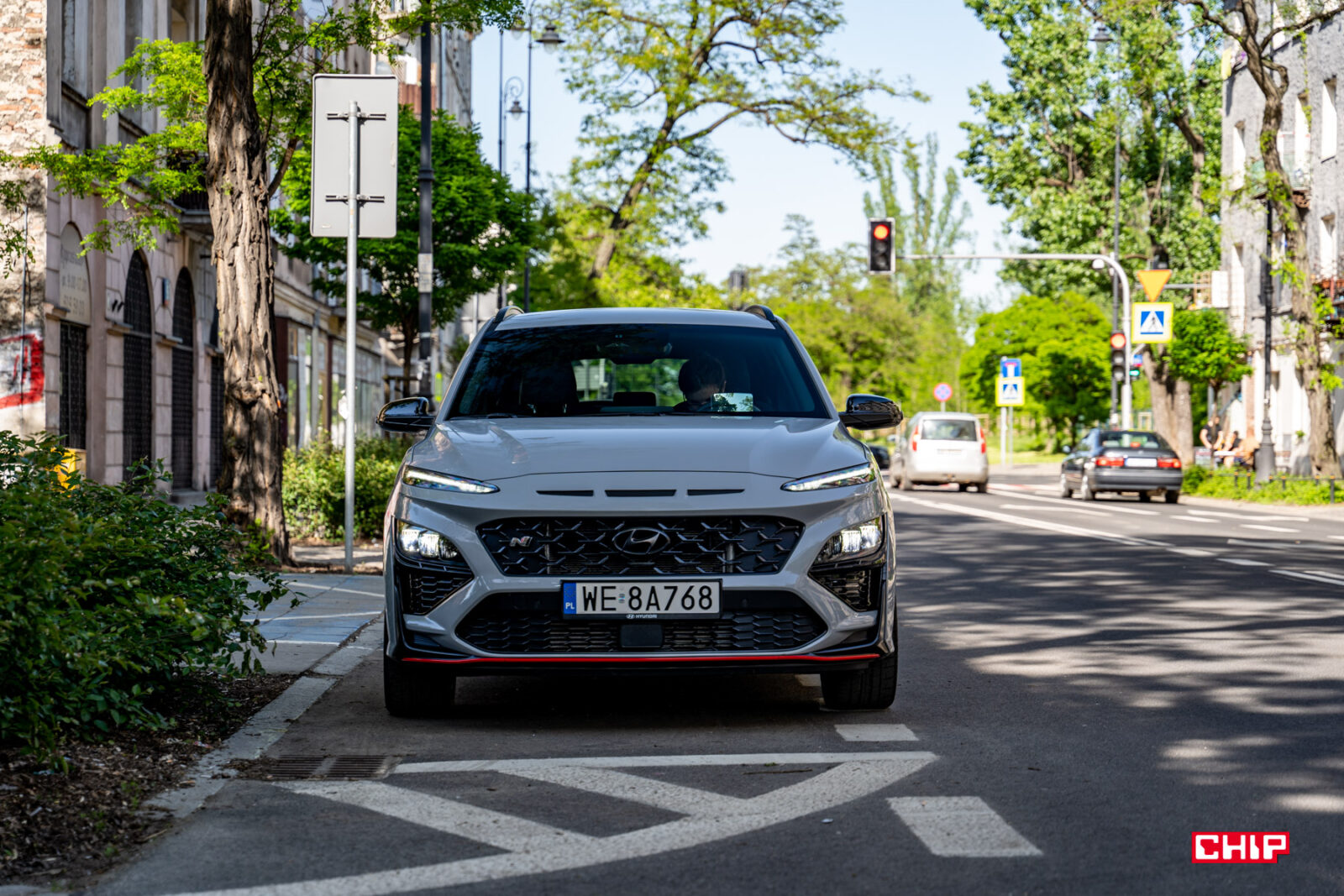 Kona N ma to do siebie, że nęci i zaczepia, proponując przejście do sportowych ustawień. Wystarczy, że zobaczy znak drogowy ostrzegający o podwójnym zakręcie, a sygnalizuje to i od razu proponuje uruchomienie trybu N. Nie Sport, a N. Nawet najbardziej zrównoważonemu kierowcy trudno byłoby jej za każdym razem odmawiać, prawda? Tym bardziej, że to tylko kwestia wciśnięcia jednego guzika na kierownicy. Po jego uruchomieniu auto natychmiast zrzuca biegi, zaczyna wyć i spina się, oczekując asertywnego prowadzenia. Dostaniecie tutaj wszystko, czego można się po tym modelu spodziewać – od świetnego przyspieszenia, przez delikatne poślizgi, po strzelający wydech.