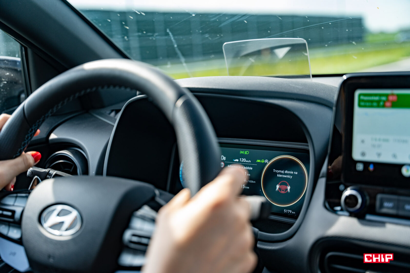 Przejechałam tym autem ponad 600 km trasami szybkiego ruchu i niestety – sztywne zawieszenie w połączeniu z hałasem w kabinie sprawiają, że po kilku godzinach takiej jazdy czułam się tak zmęczona, jakbym przekopała porządny rów. Pod koniec trasy, chcąc odpocząć chociaż przez chwilę, skorzystałam z tempomatu i systemu podążania na pasie ruchu, ale tutaj pojawił się spory problem. Auto, co jest zrozumiałe, wymaga trzymania rąk na kierownicy i nawet pomimo jej kurczowego ściskania, co jakiś czas zaczynało piszczeć i wyrzucało komunikat o konieczności… trzymania rąk na kierownicy. Wygląda to dokładnie tak: