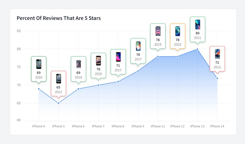 Firma PerfectRec opracowała raport, w którym zgromadziła 669 tys. opinii klientów na temat smartfonów Apple’a, począwszy od iPhone’a 4 z 2010 roku. Liczba recenzji na temat każdego modeli była różna (wahała się od 2304 do 56 832), jednak na ich podstawie udało się stworzyć wykresy, pokazujące wzrost zadowolenia z kolejnych serii, objawiający się wzrostem odsetku pięciogwiazdkowych opinii z generacji na generację począwszy od iPhone’a 5. To jasno pokazuje, że Apple spełniał oczekiwania klientów wprowadzanymi nowościami. Dzięki temu w 2021 roku iPhone’y 13 mogły osiągnąć rekordowe 80% pięciogwiazdkowych recenzji.